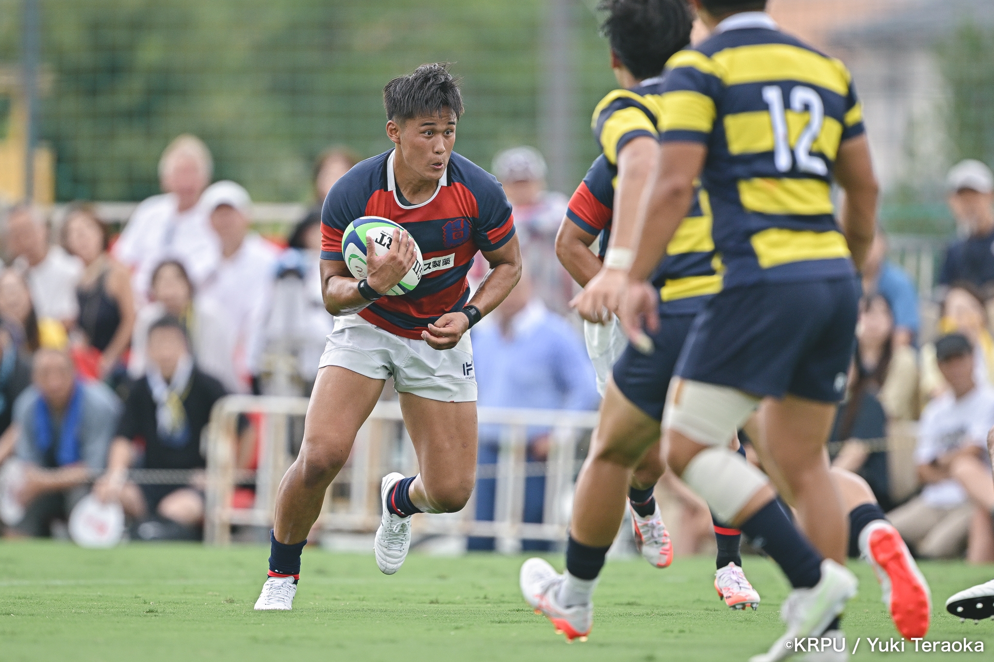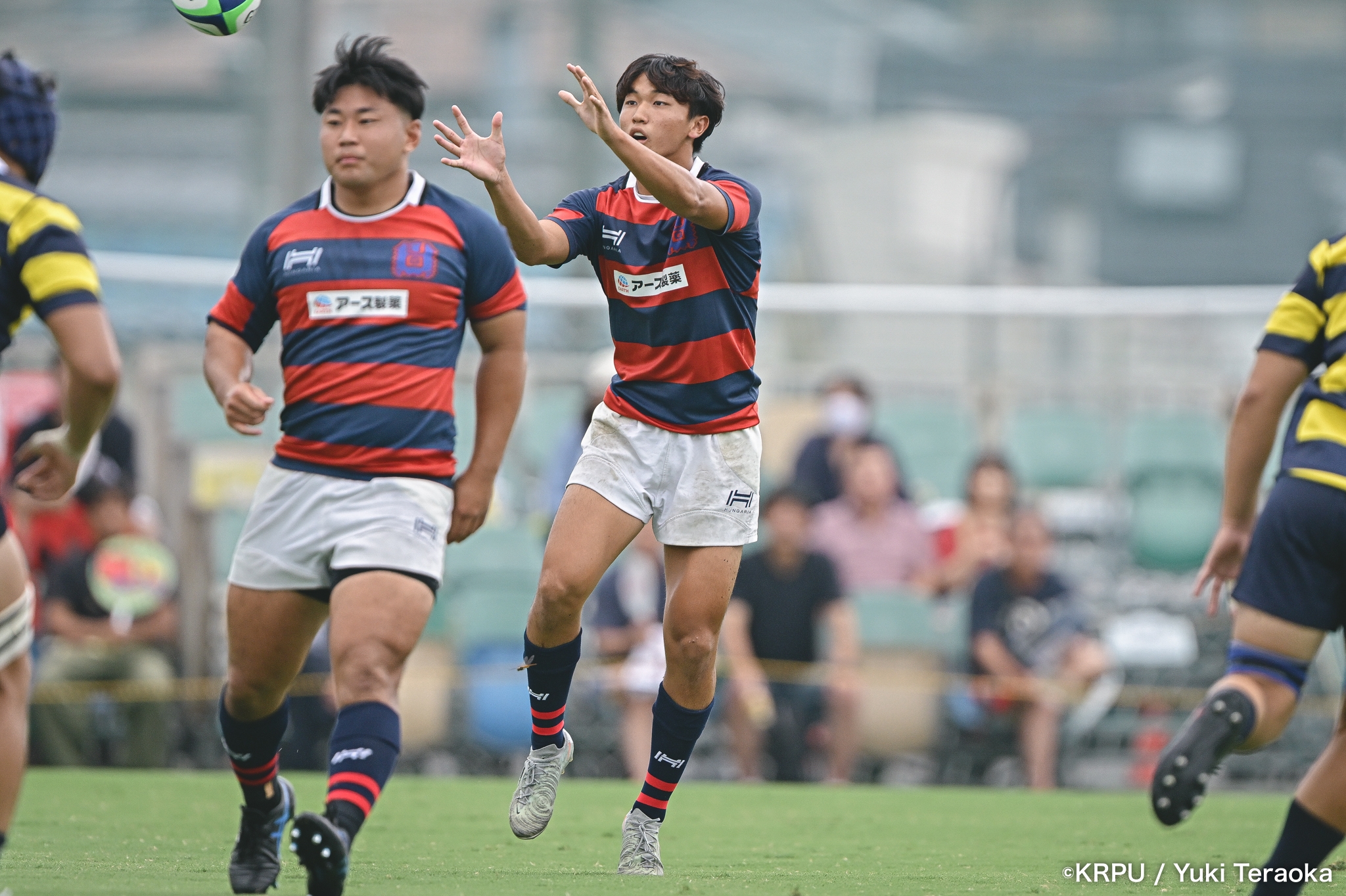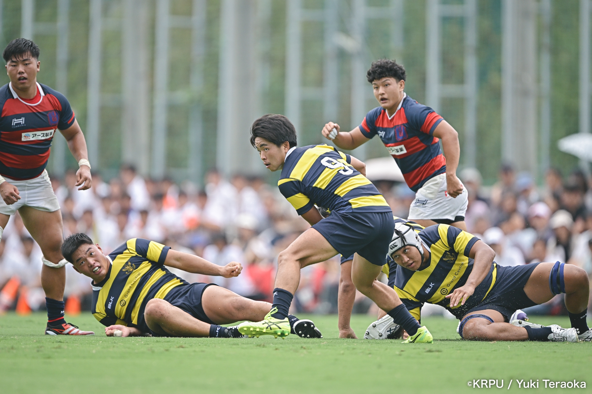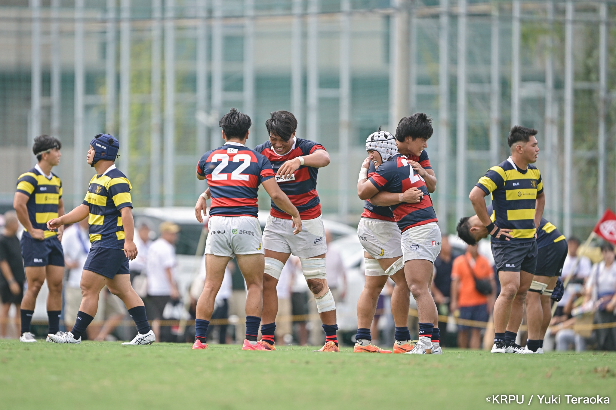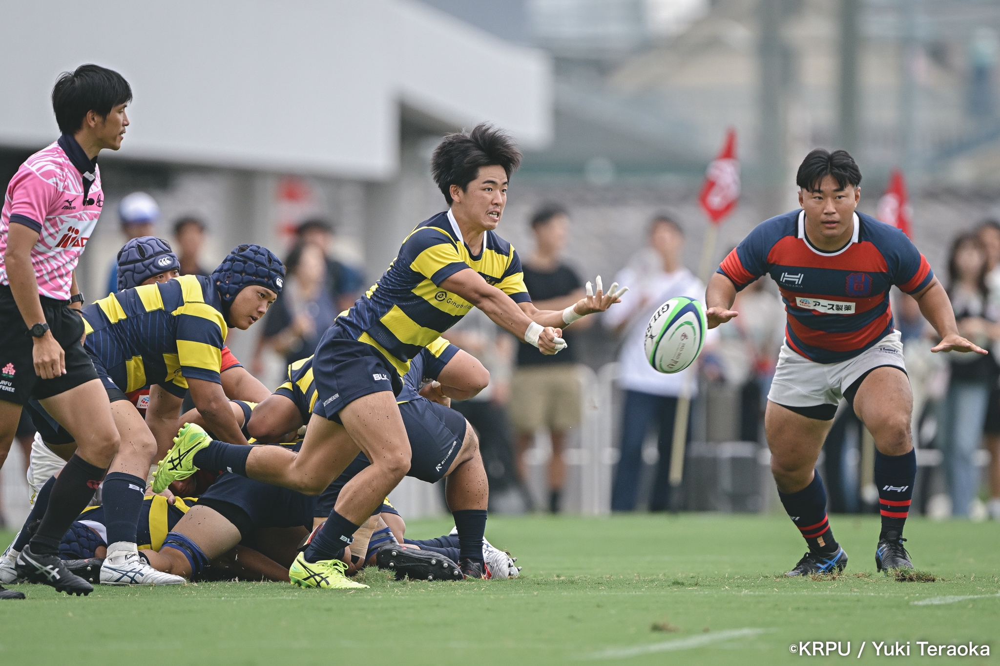 勢いに乗る関学は37分、立命陣左10m付近のラインアウトからFWがモールで前進。できたラックから右へ展開し、SH⑨川原大―SO⑩新井―CTB⑫金正優作。CTB⑫金正がブレイクし、最後はFB⑮的場が右隅へトライ。GK不成功で34-10。さらにロスタイム44分にもWTB⑭成田がトライし、SO⑩新井のゴールが決まり41-10。