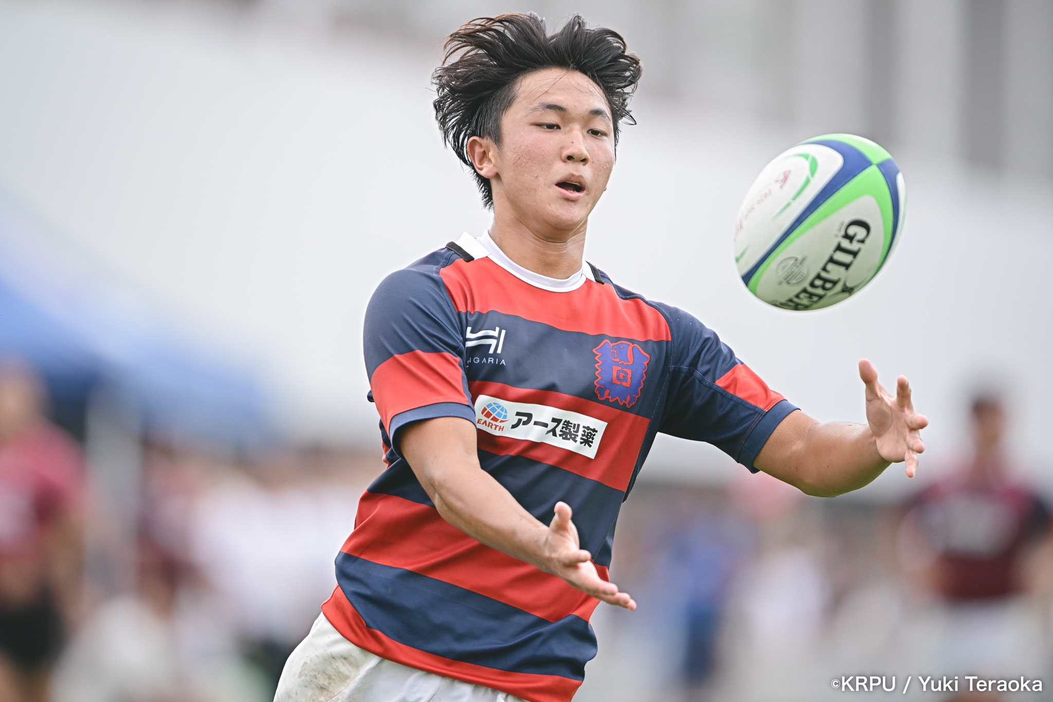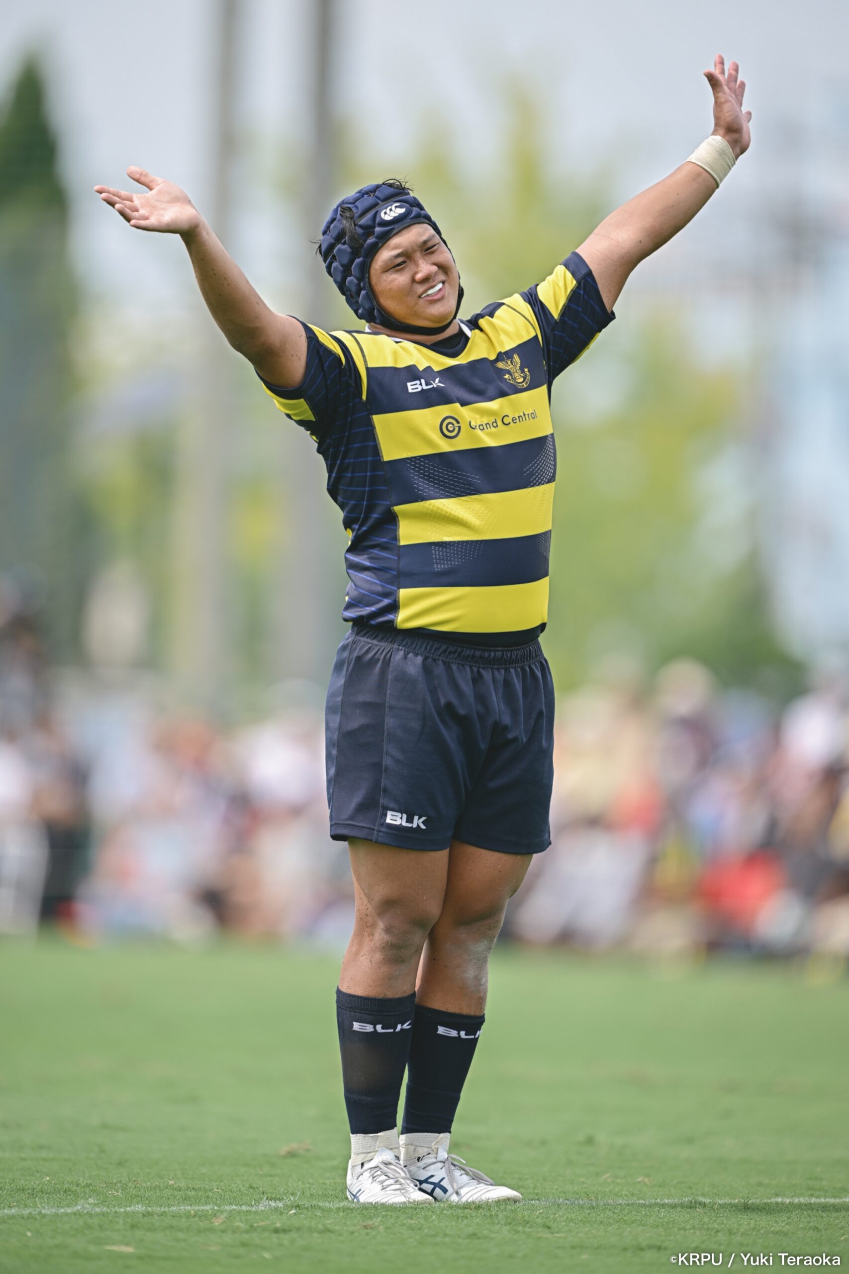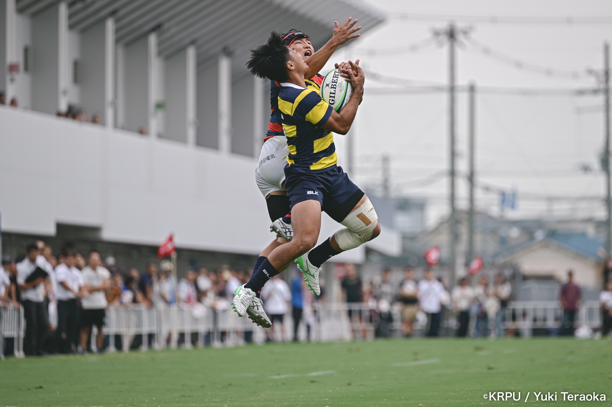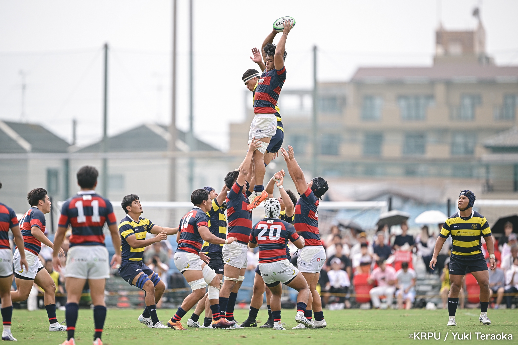勢いに乗る関学は37分、立命陣左10m付近のラインアウトからFWがモールで前進。できたラックから右へ展開し、SH⑨川原大―SO⑩新井―CTB⑫金正優作。CTB⑫金正がブレイクし、最後はFB⑮的場が右隅へトライ。GK不成功で34-10。さらにロスタイム44分にもWTB⑭成田がトライし、SO⑩新井のゴールが決まり41-10。