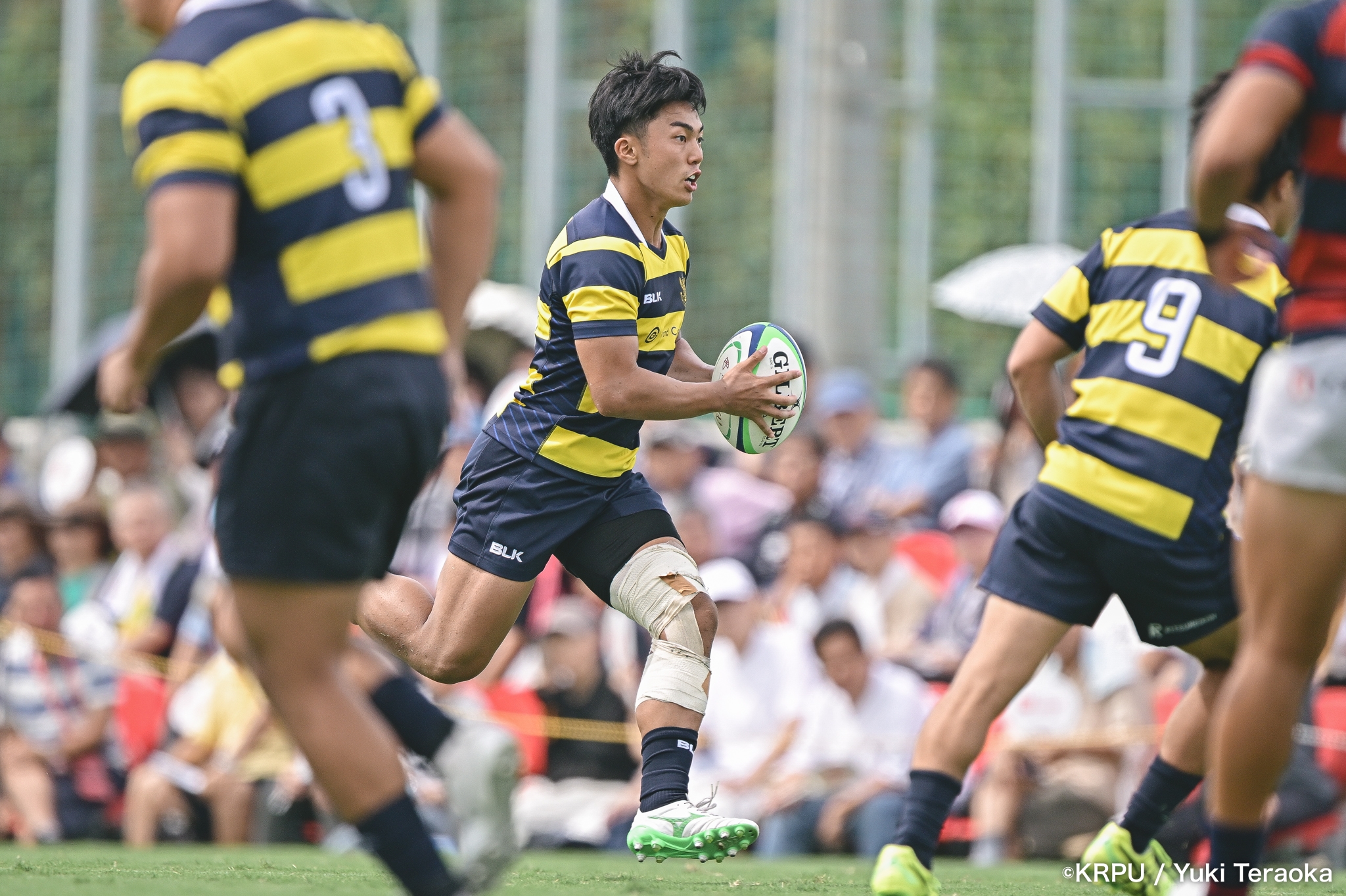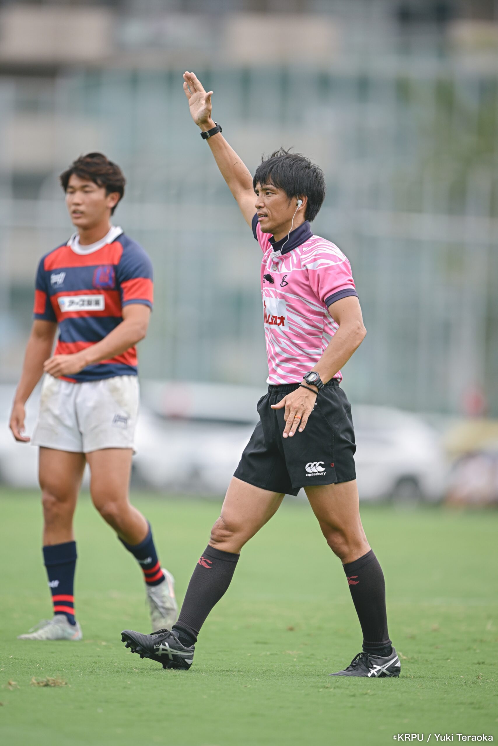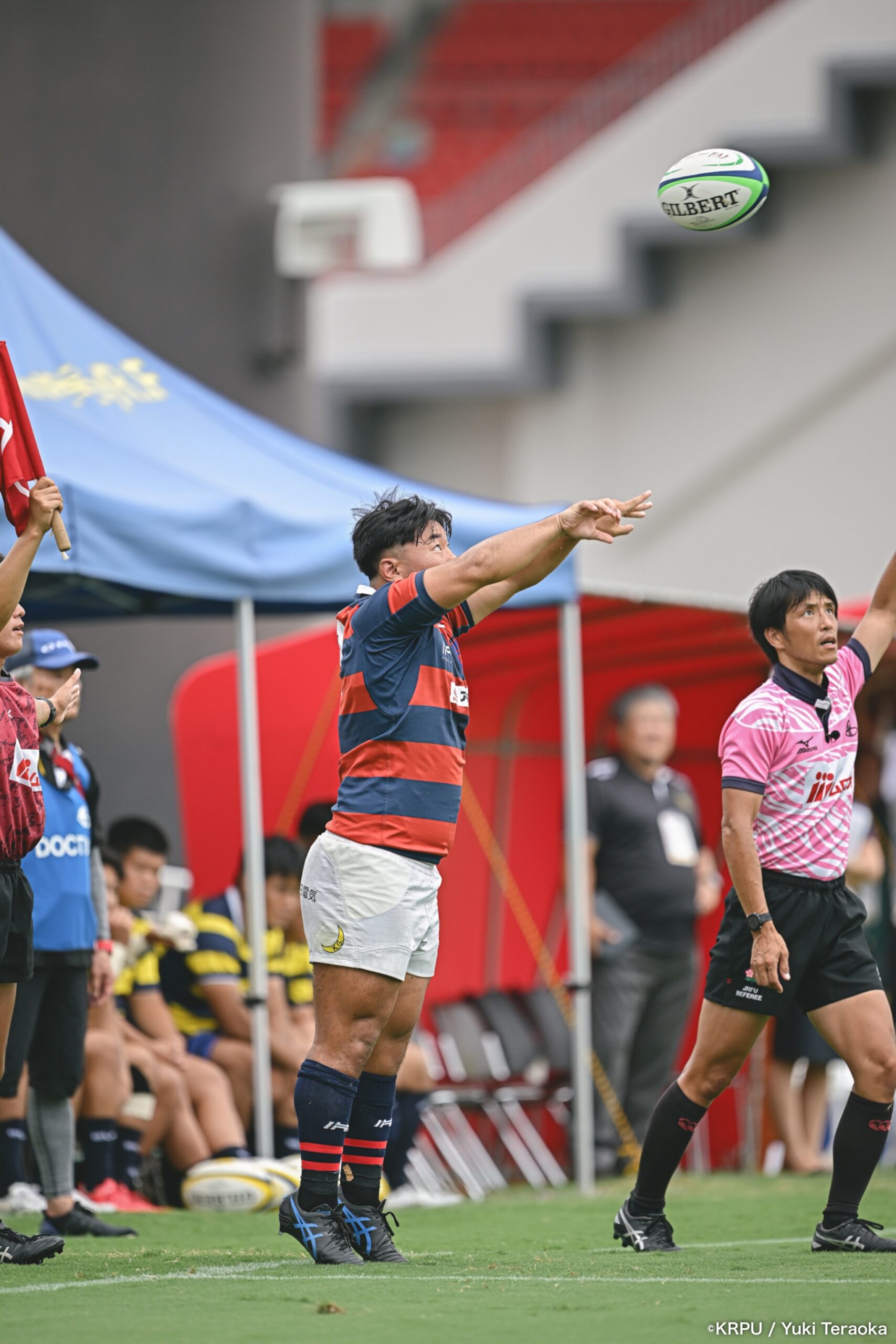 立川誠道レフリーのホイッスル。風下の立命が、SO⑩川口慧大のキックで試合開始。