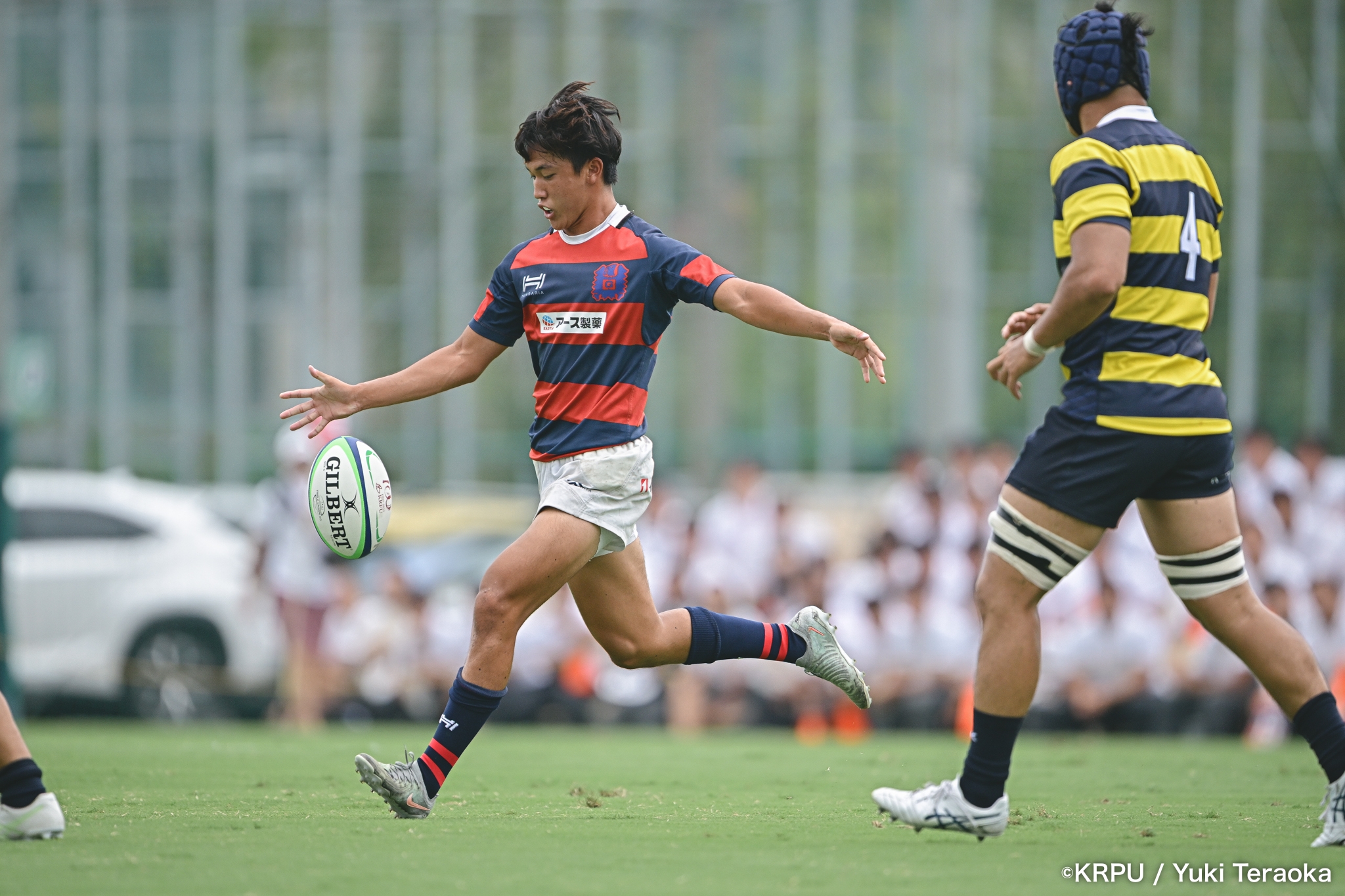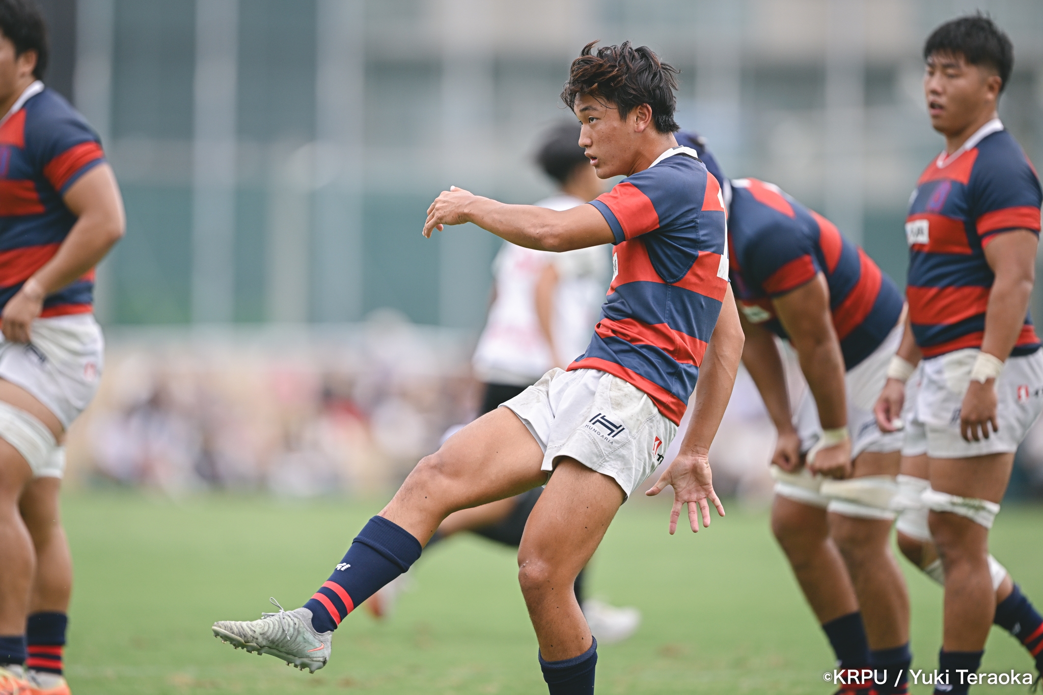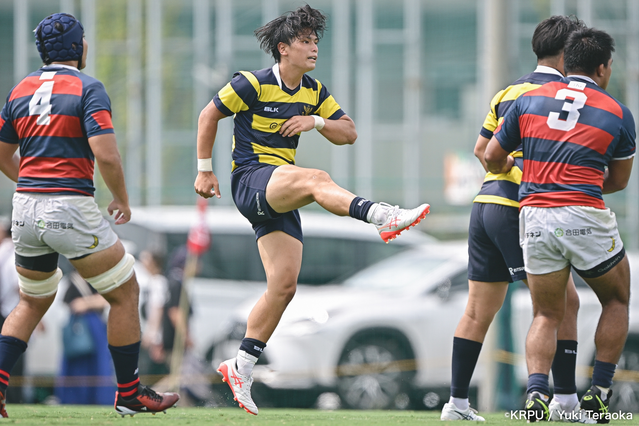前半中盤は中央付近で、関学のアタックを立命が激しいディフェンスで凌ぐ展開。得点が動いたのは34分。立命陣右中間22m付近で立命のオフサイド。関学はPGを選択し、SO⑩新井が決めて10-0。