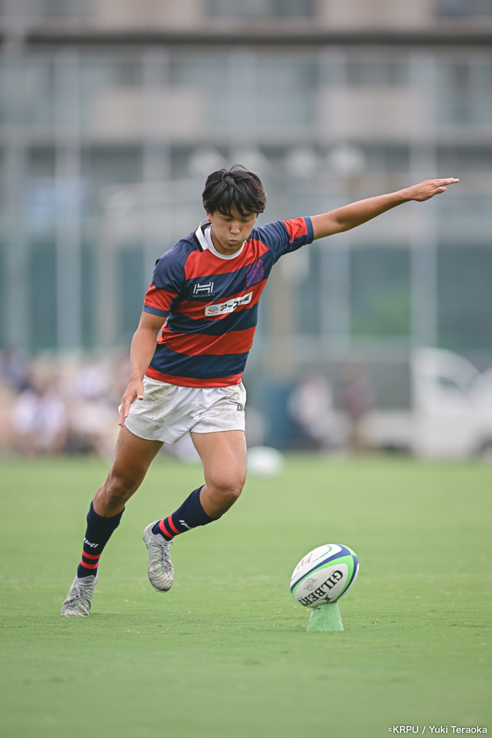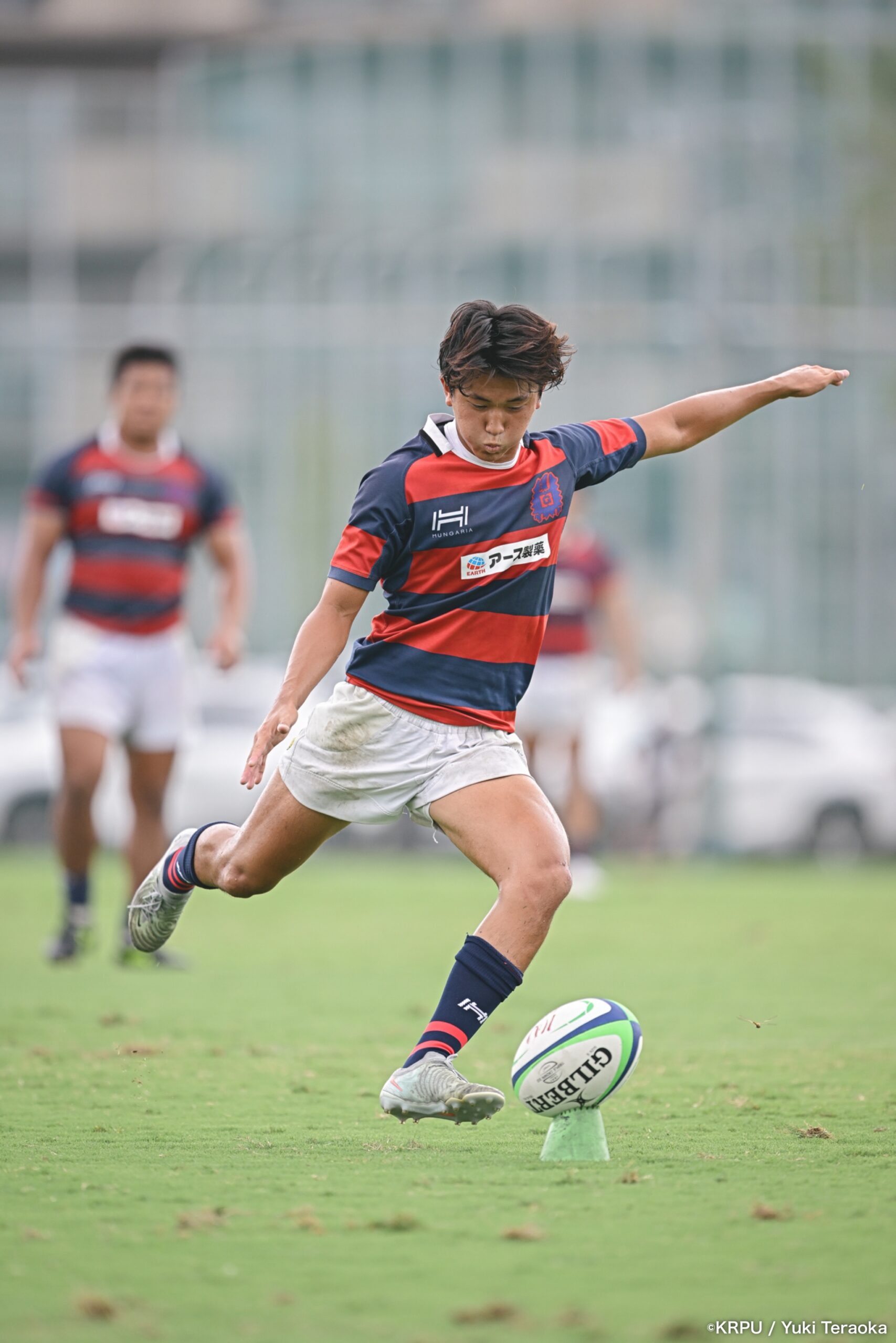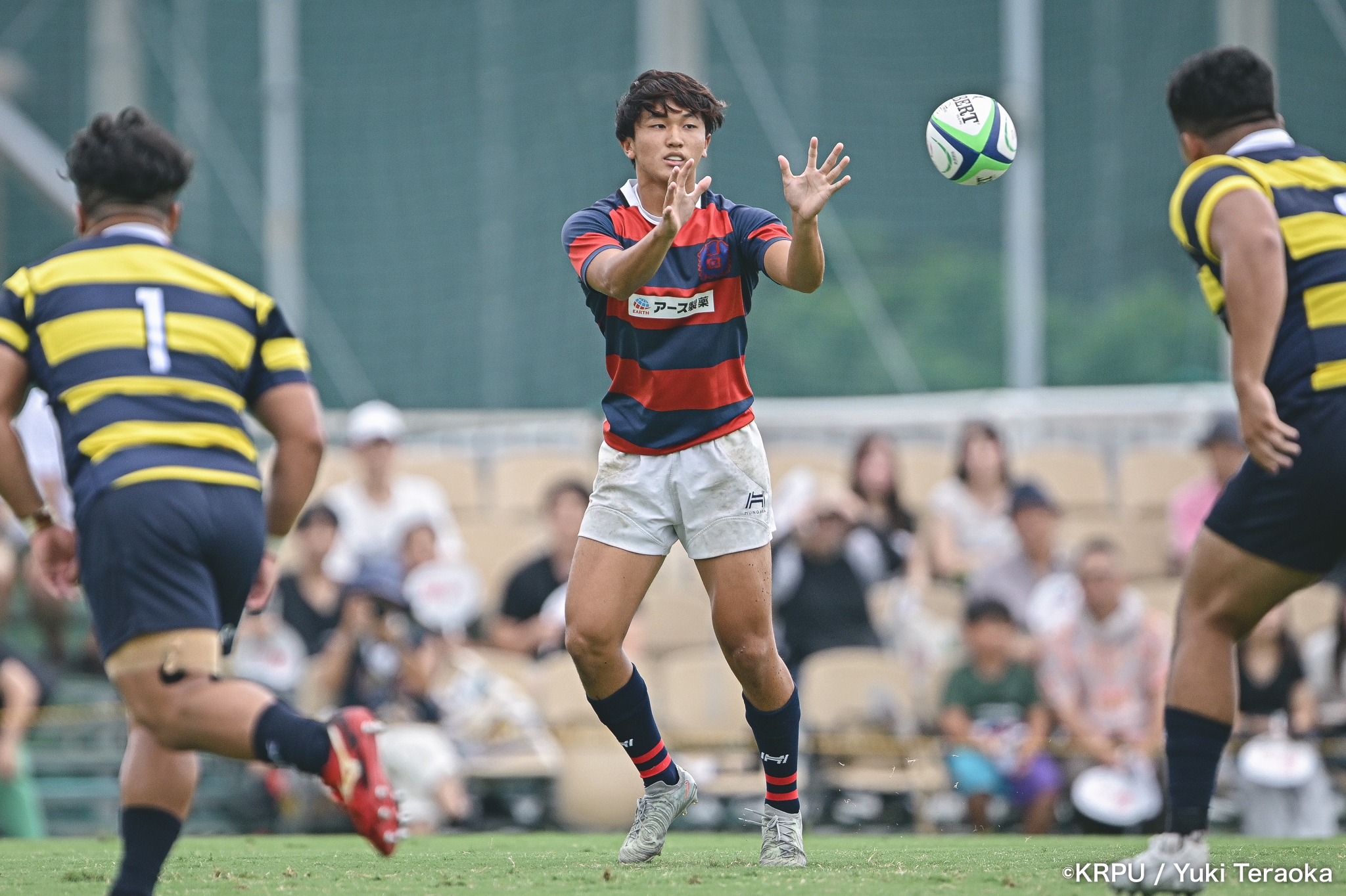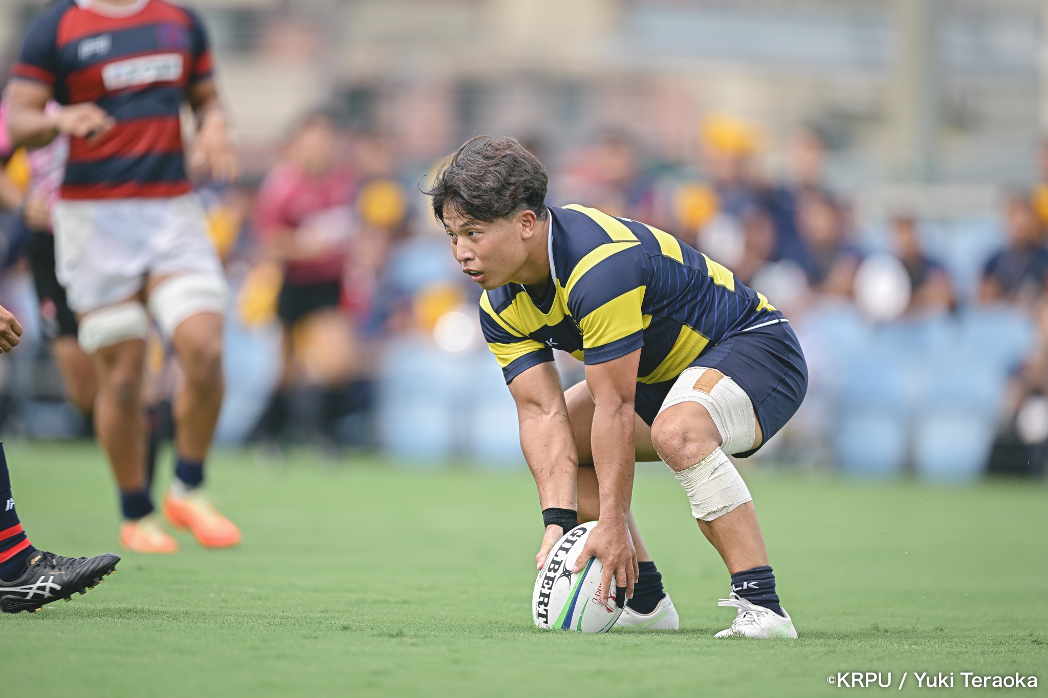 前半中盤は中央付近で、関学のアタックを立命が激しいディフェンスで凌ぐ展開。得点が動いたのは34分。立命陣右中間22m付近で立命のオフサイド。関学はPGを選択し、SO⑩新井が決めて10-0。