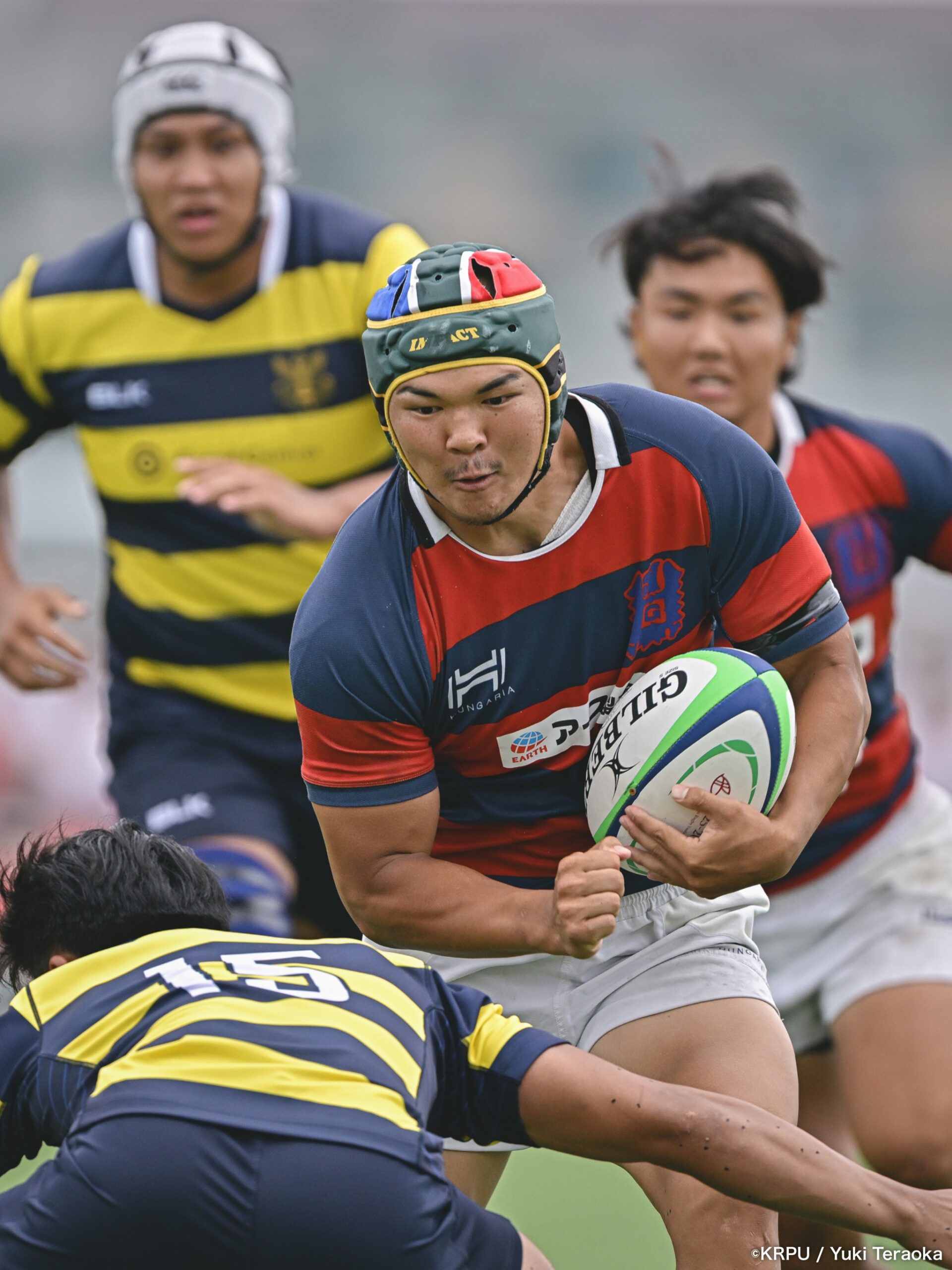 しかし前半終了間際に立命の反撃。関学の反則が増え、関学TLに迫ると、40分、左TL5mのラインアウトでFL⑥小山虎太郎がクリーンキャッチしてモール。そのまま押し込み、HO②大本竣士が左中間にトライ(GK不成功)で10-5。続くロスタイム45分、右サイドの同様のラインアウトから今度はLO⑤鈴木孝昌がキャッチしてモール、再びHO②大本が右にトライし10-10と追いついたところで前半終了(GK不成功)。予想どおりの接戦となる。