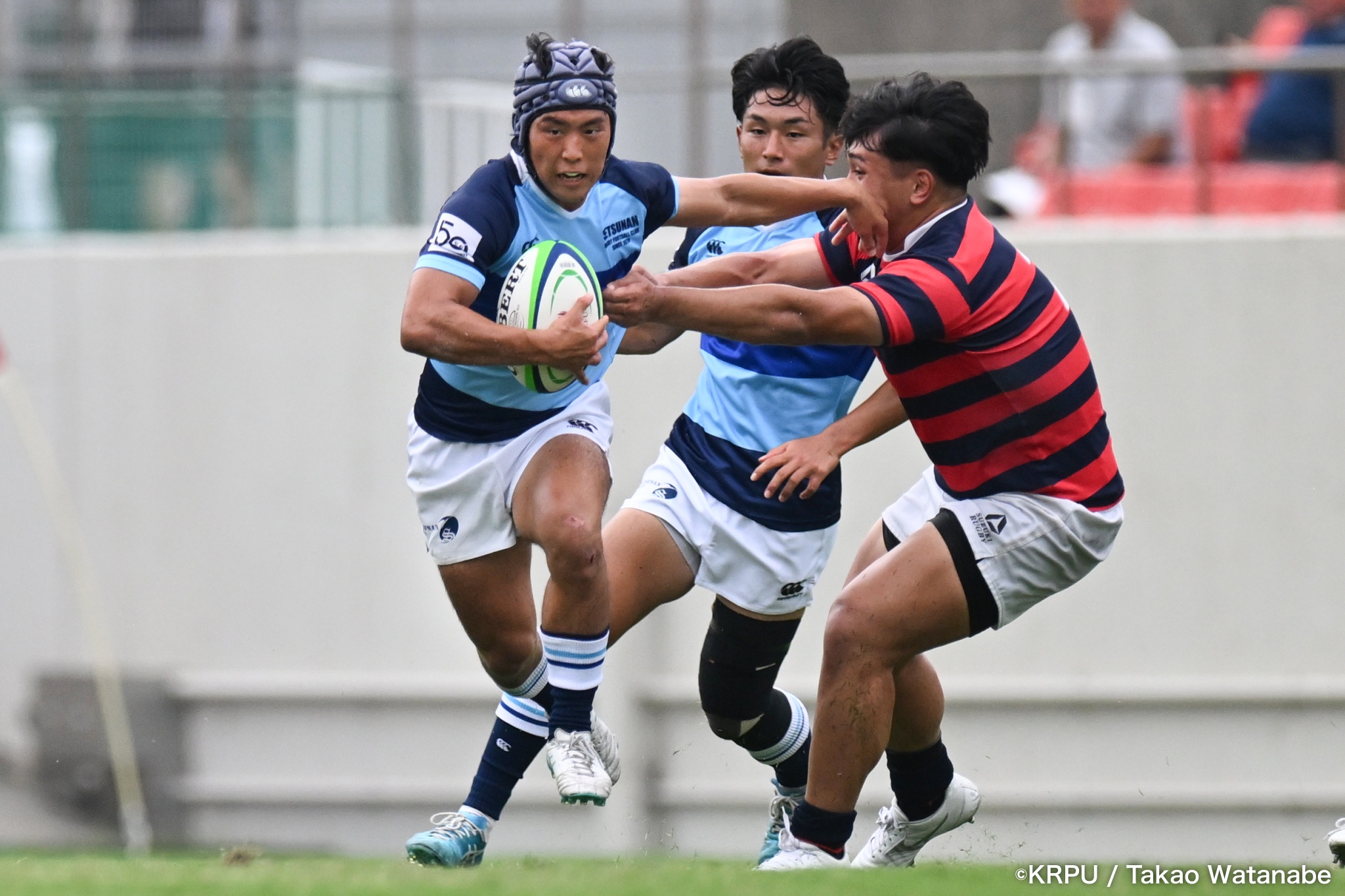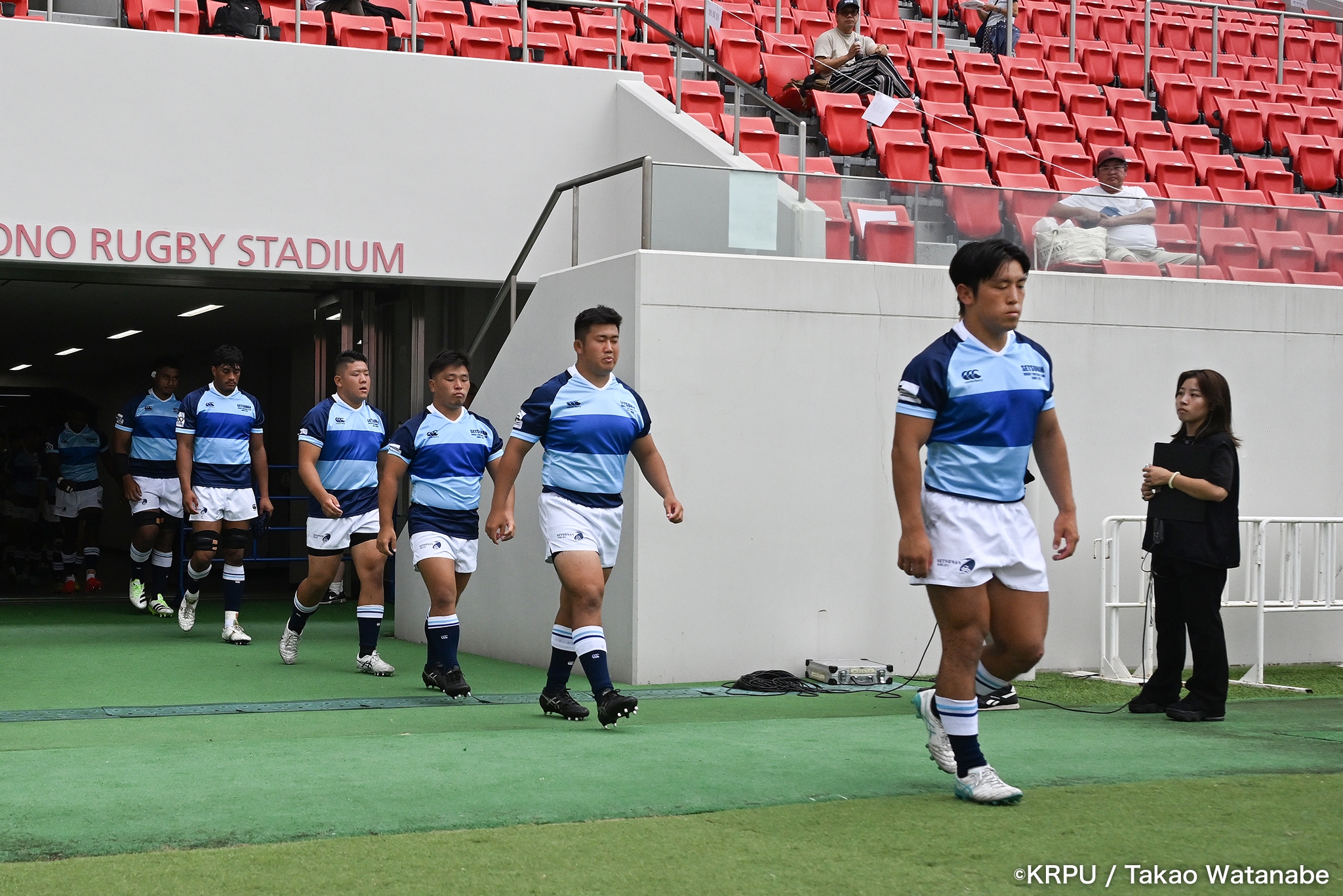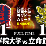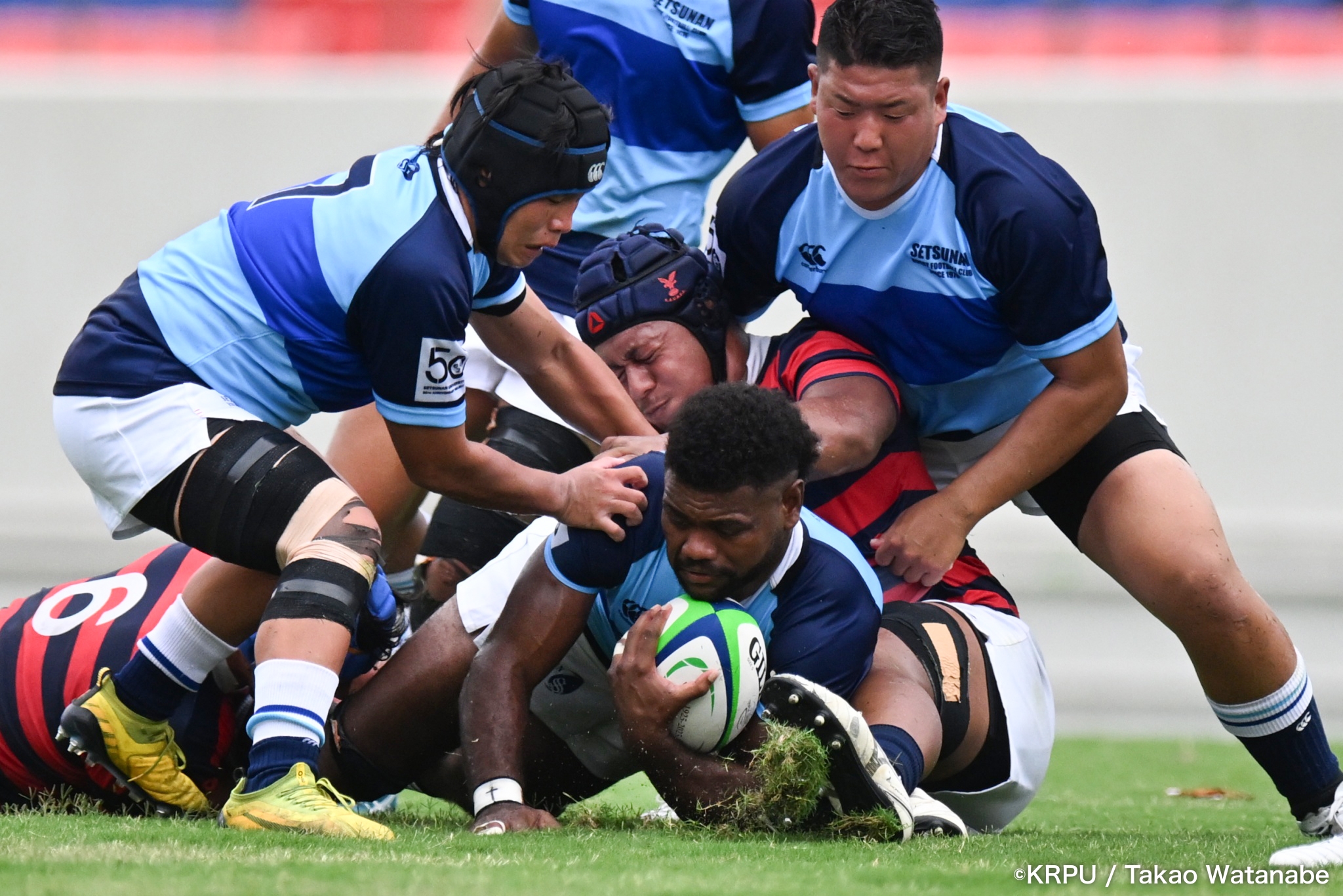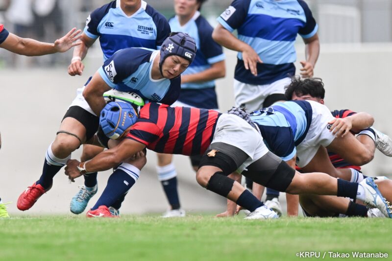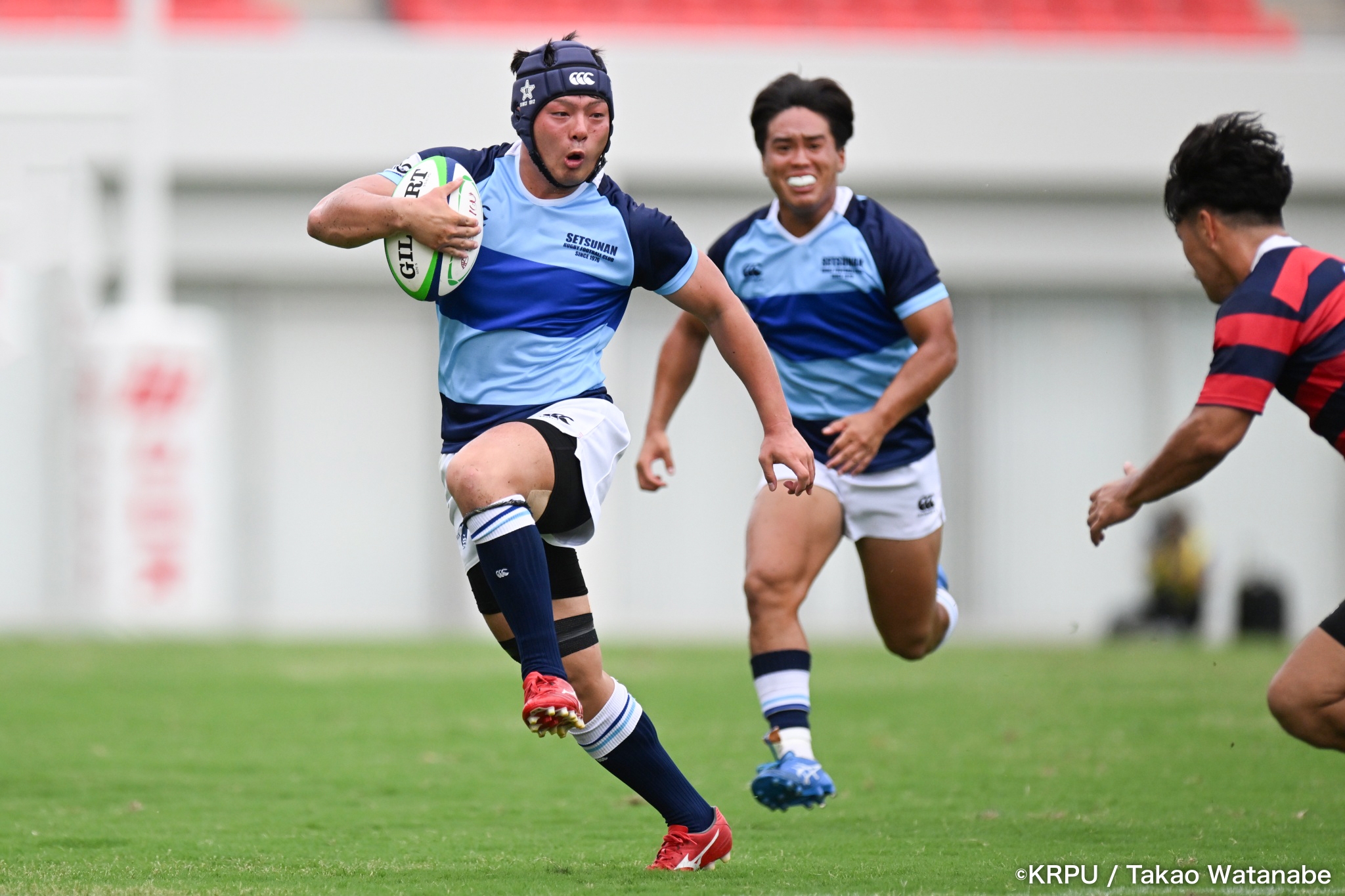 2025ムロオ関西大学ラグビーAリーグは、東大阪市花園ラグビー場に全8チームが集結して開幕した。第1グラウンドの第1試合は、残暑厳しい曇天・弱風の中、摂南大学(以下、摂南大)と京都産業大学(以下、京産大)が対戦。摂南大は「挑む」をテーマに、FW・BKともにボールを動かすラグビーを展開する。京産大は「the ONE」を掲げ、泥臭くチャレンジ精神で勝利を目指す。