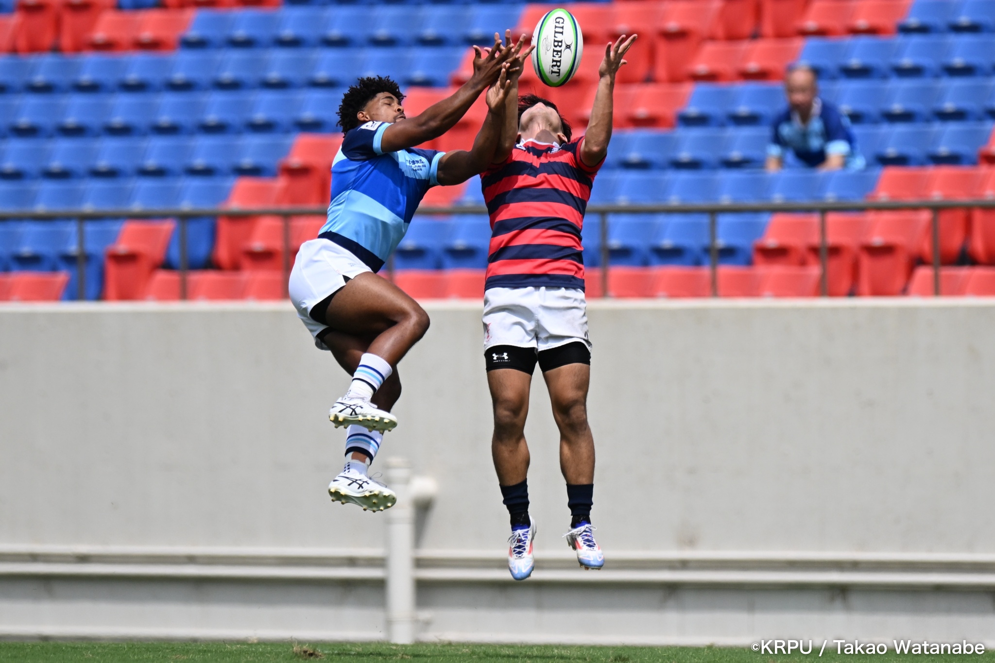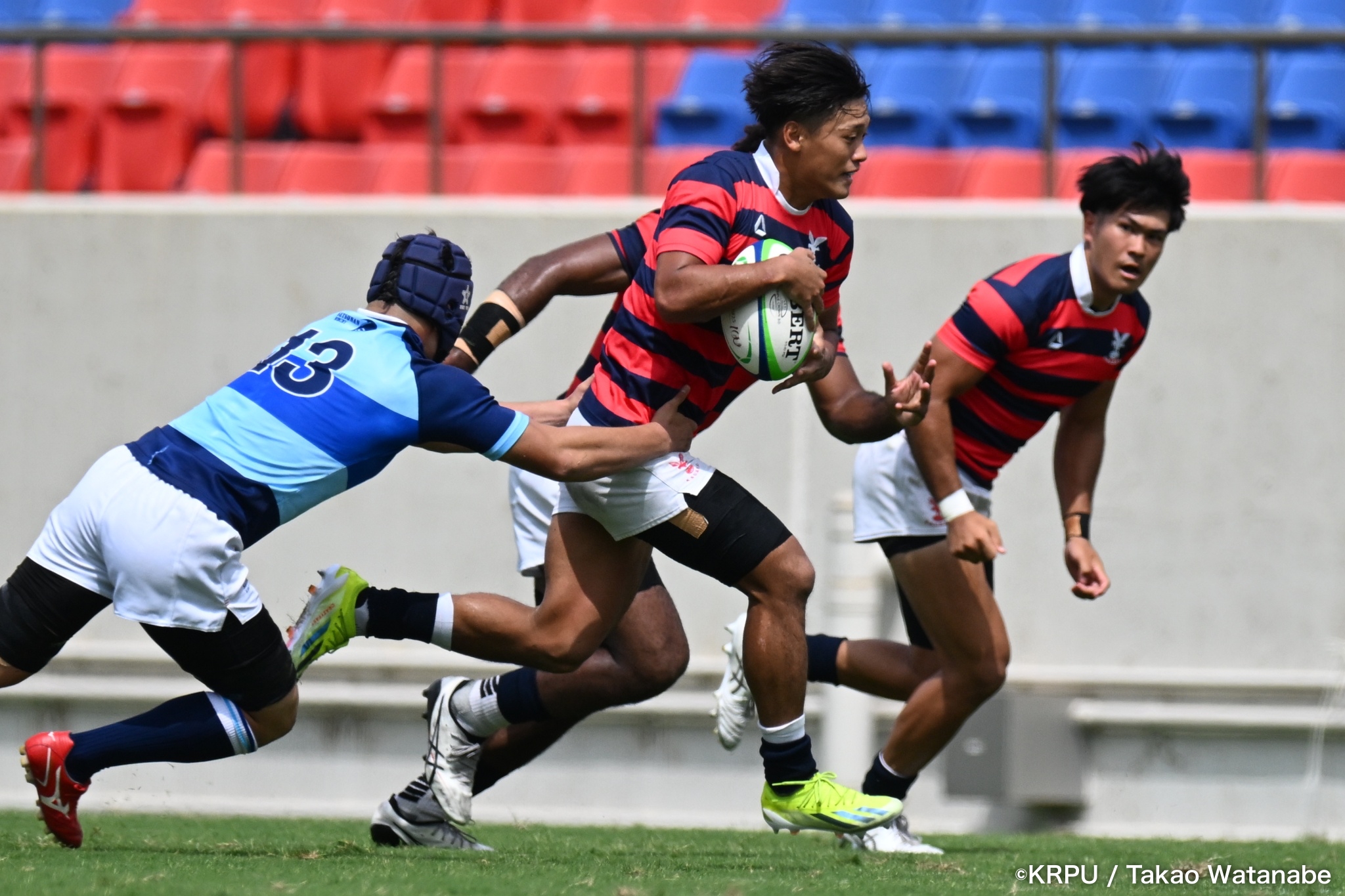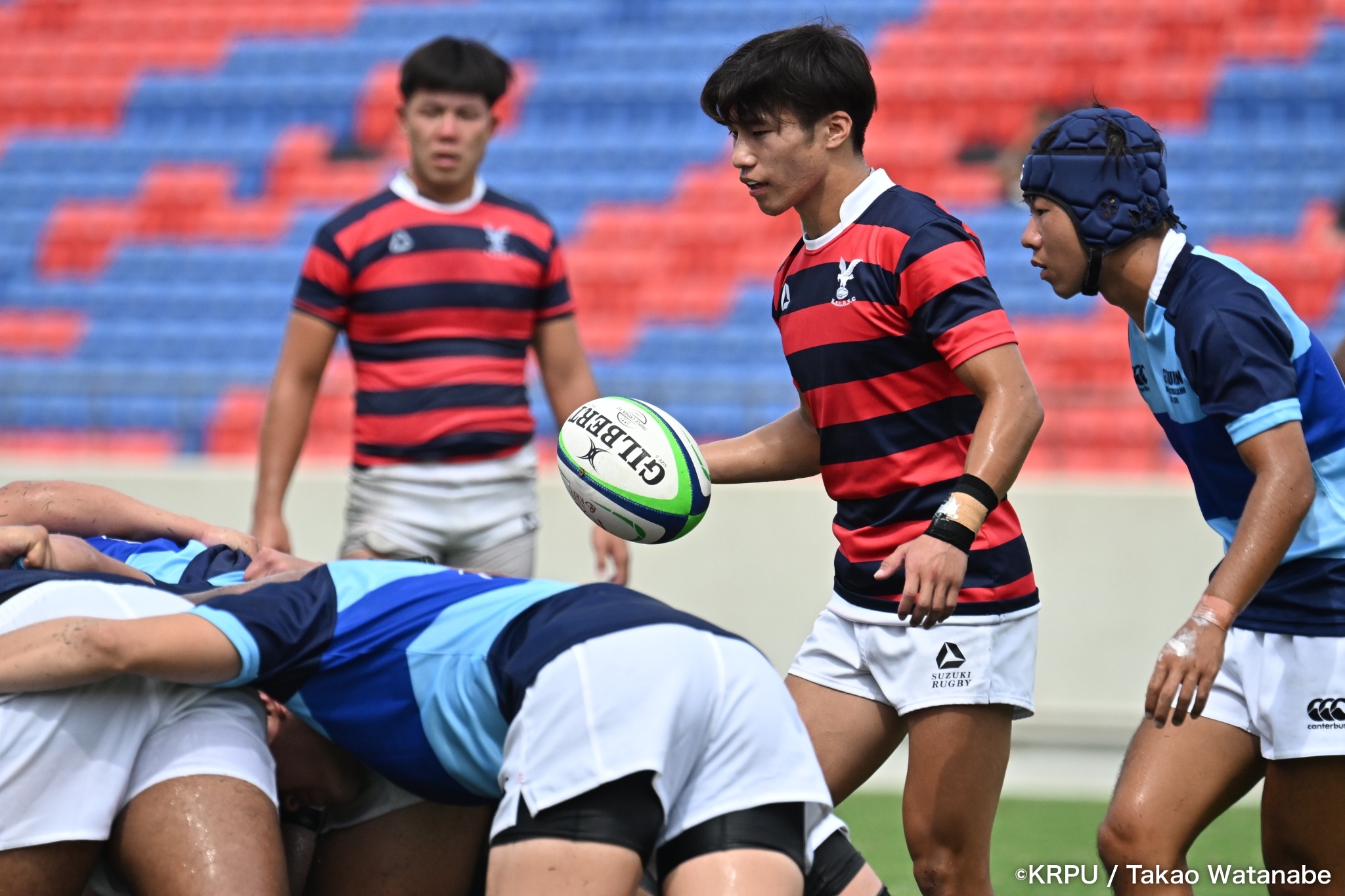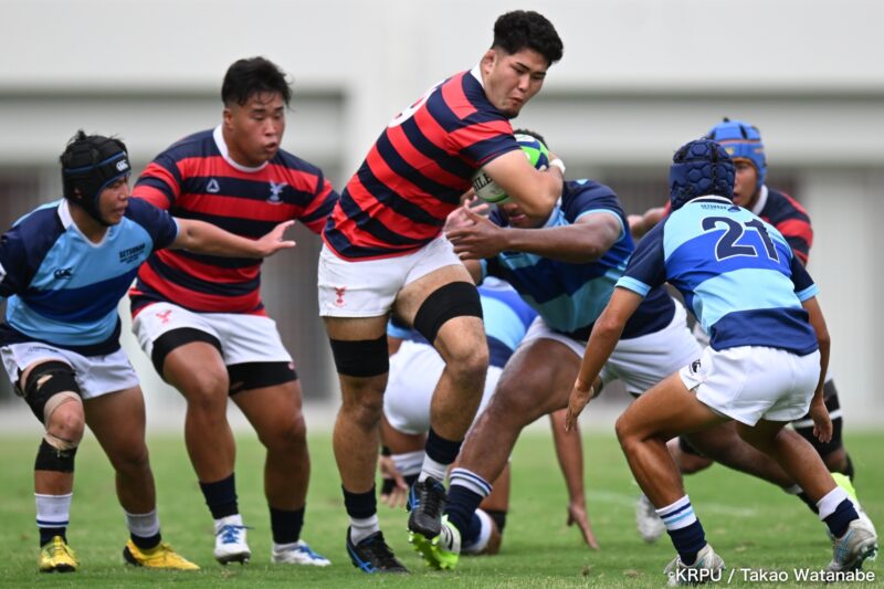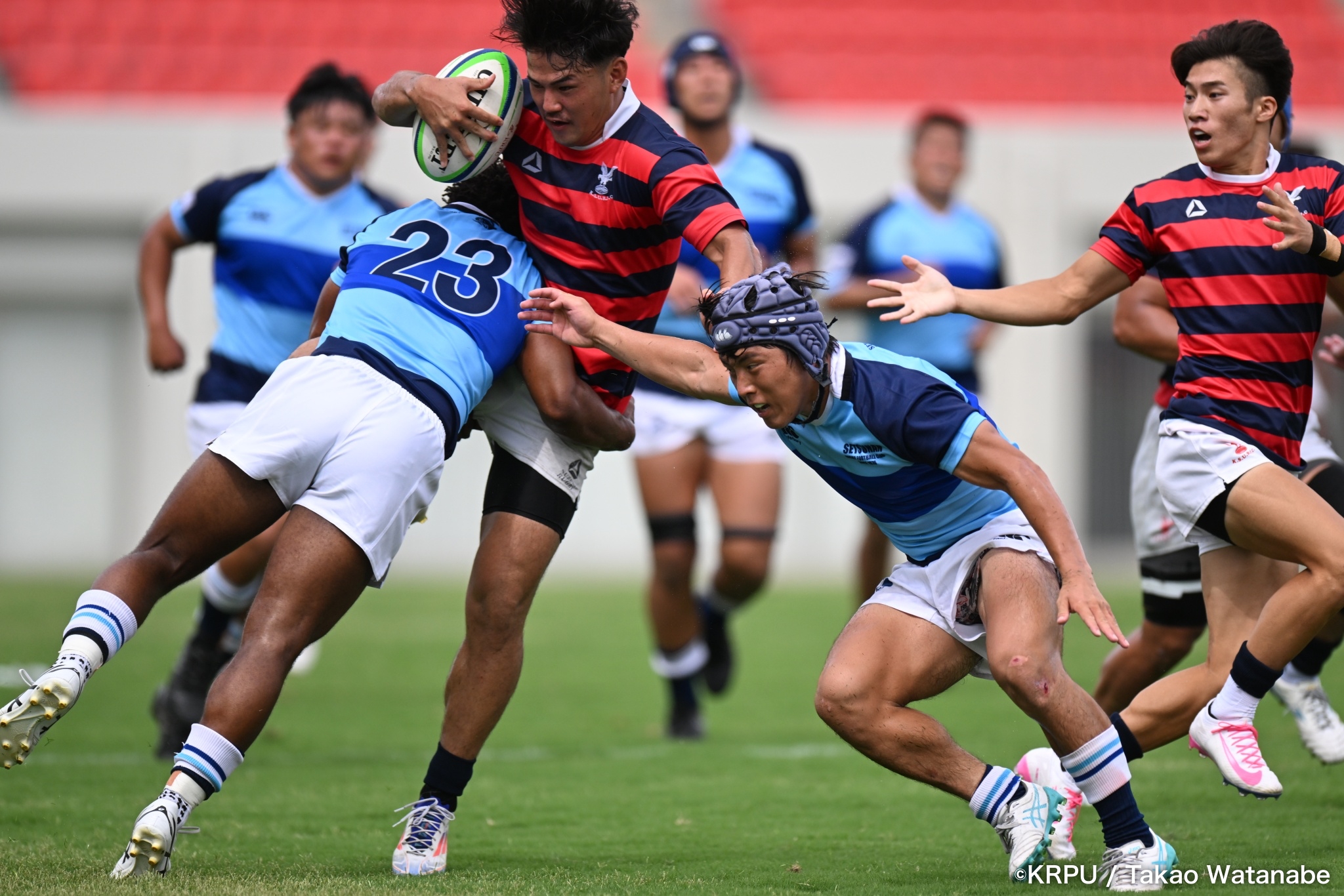 2025ムロオ関西大学ラグビーAリーグは、東大阪市花園ラグビー場に全8チームが集結して開幕した。第1グラウンドの第1試合は、残暑厳しい曇天・弱風の中、摂南大学(以下、摂南大)と京都産業大学(以下、京産大)が対戦。摂南大は「挑む」をテーマに、FW・BKともにボールを動かすラグビーを展開する。京産大は「the ONE」を掲げ、泥臭くチャレンジ精神で勝利を目指す。