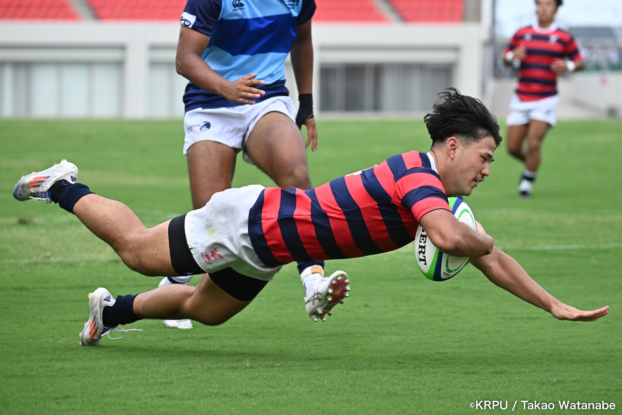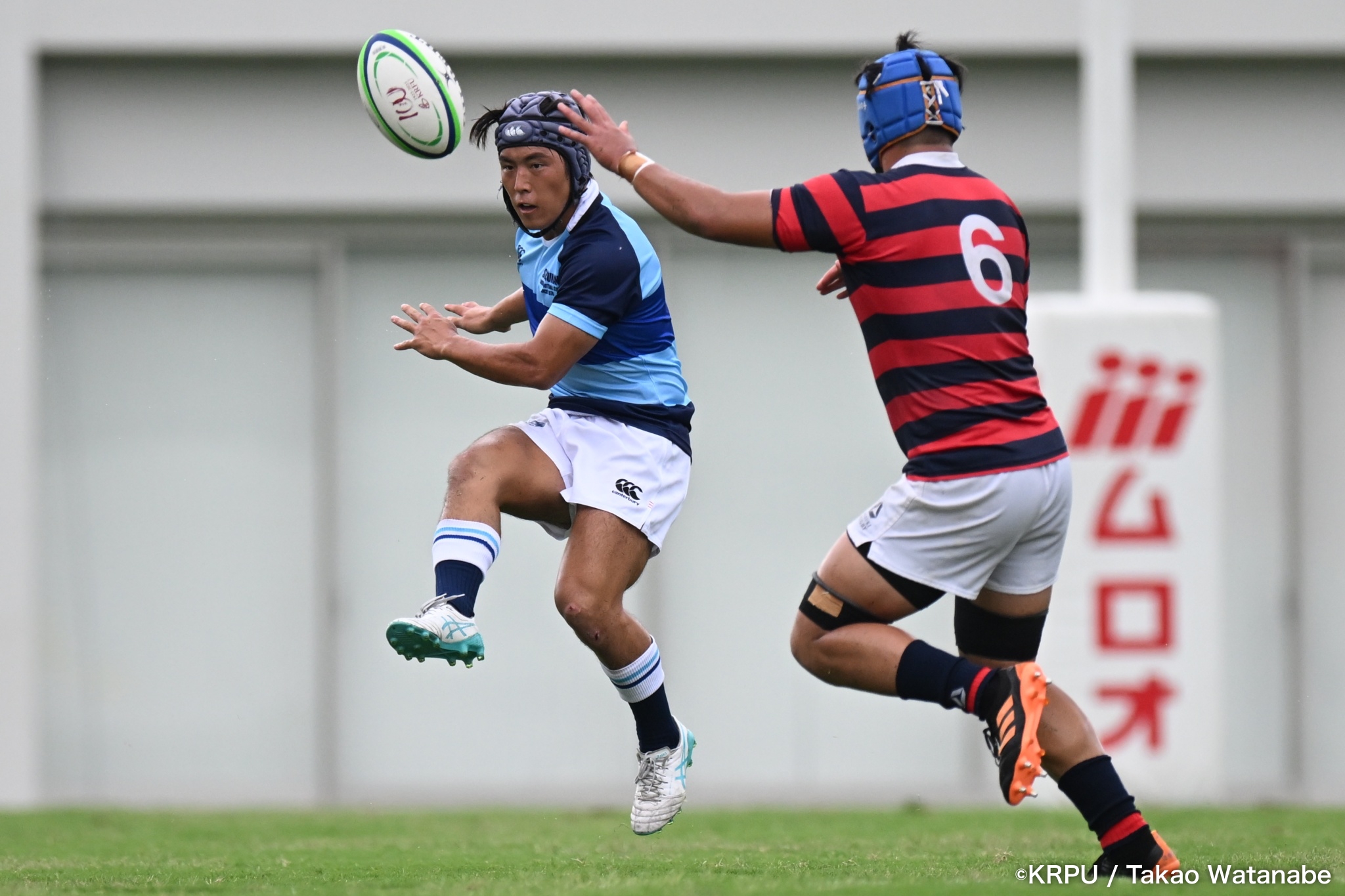 19分、京産大はWTB⑭小林が右中間にトライ。GはSH⑨高木が成功、0-45。