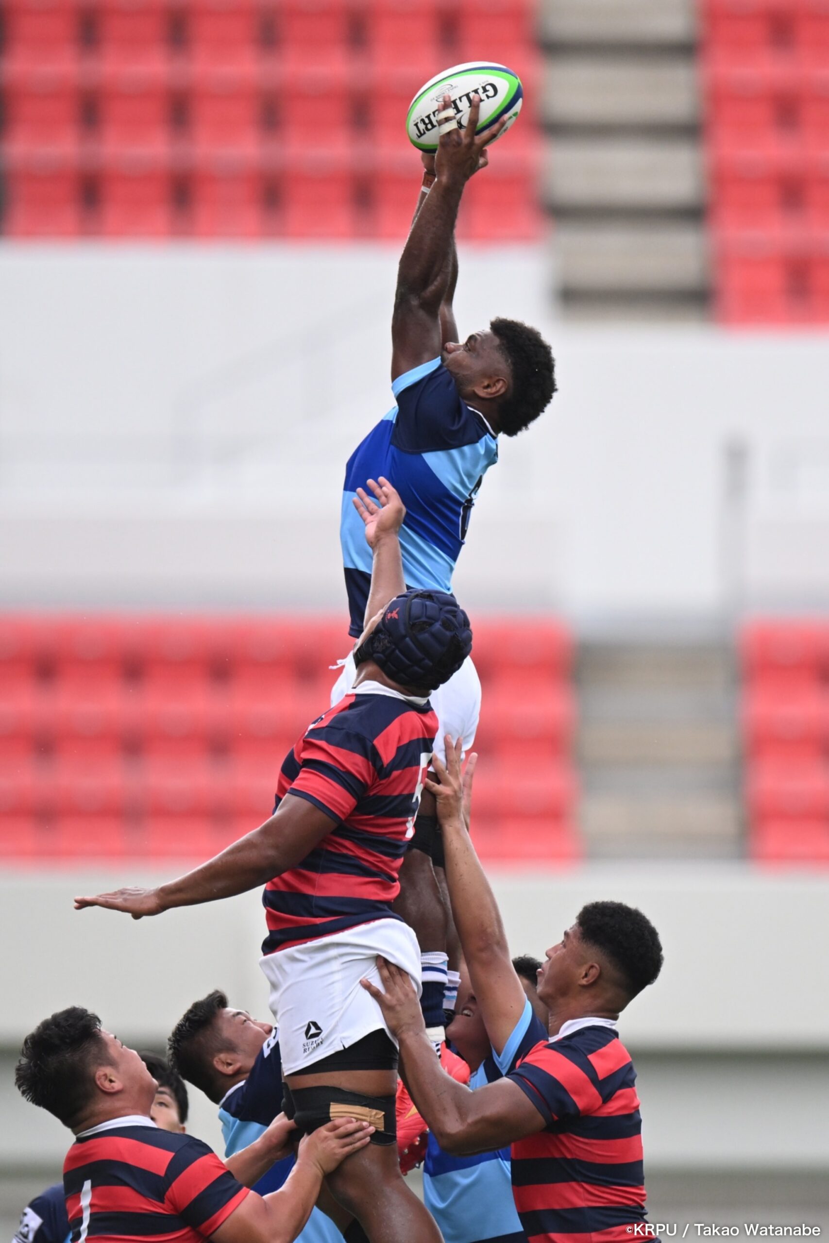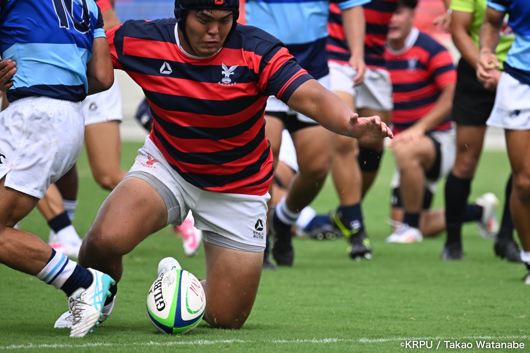 31分、京産大が敵陣ゴール前8mのラインアウトからモールを形成し、最後はFL⑥平野が左中間にトライ。G不成功、0-50。