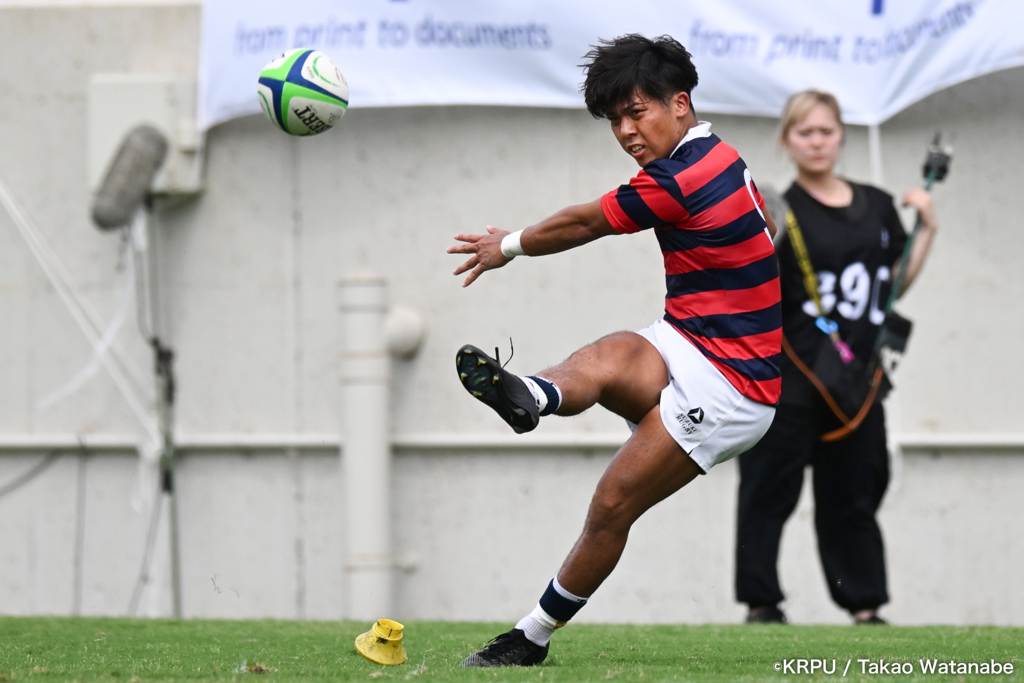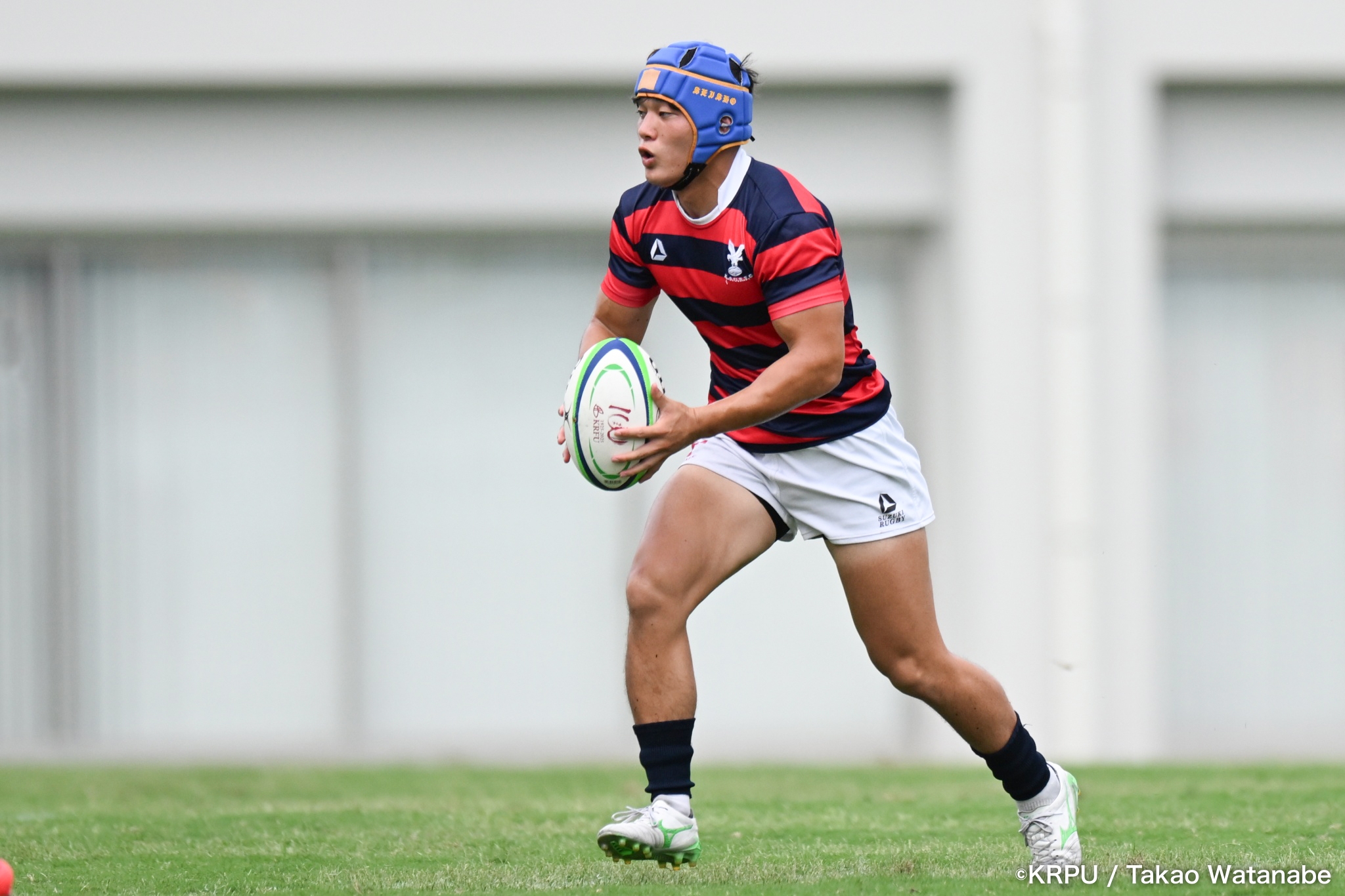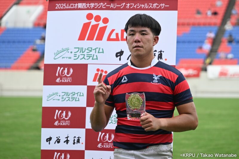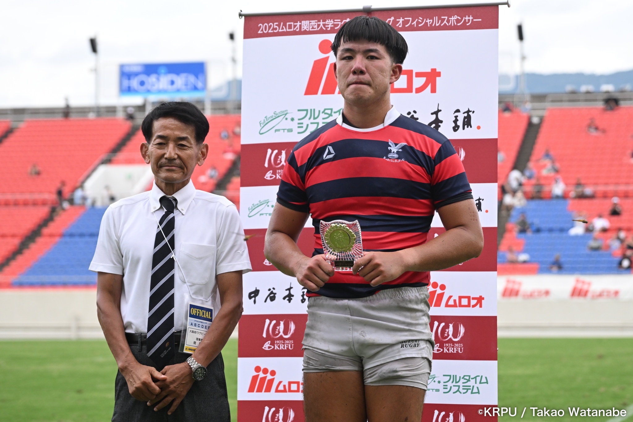 POMには、正確なキックで敵陣まで攻め込み、攻撃でも起点となるパスをつなぎ、勝利に大きく貢献した京都産業大学副キャプテン、SO⑩吉本大悟が選ばれた。