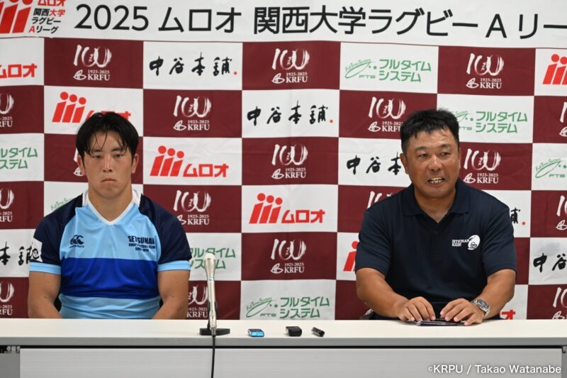 2つ目の質問、どう修正していくかについて。基本的なことを100%できるようにすることです。今日はハンドリングエラーが多くありました。早い選手は小学生からラグビーを始めていると思いますが、キャッチやパスなど基本的なことができていない。そこを普段の練習から全員が高い意識で取り組まなければいけません。関西の大学のレベルが年々高くなる中で、摂南大が取り残されるのではないかという危機感を持っています。大学スポーツの肝は4回生です。今日の試合を受けて、4回生がどうまとめてくれるかに尽きます。