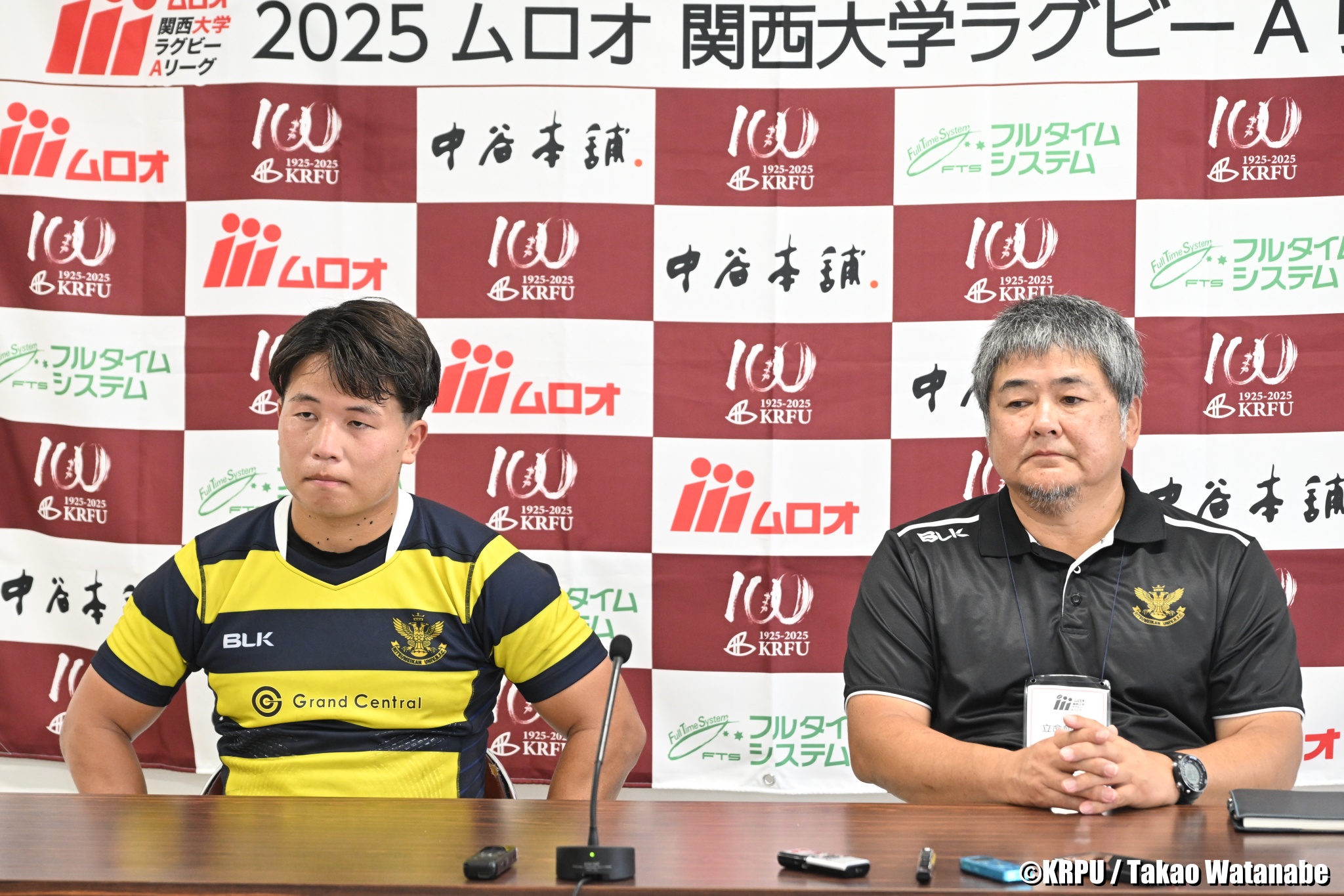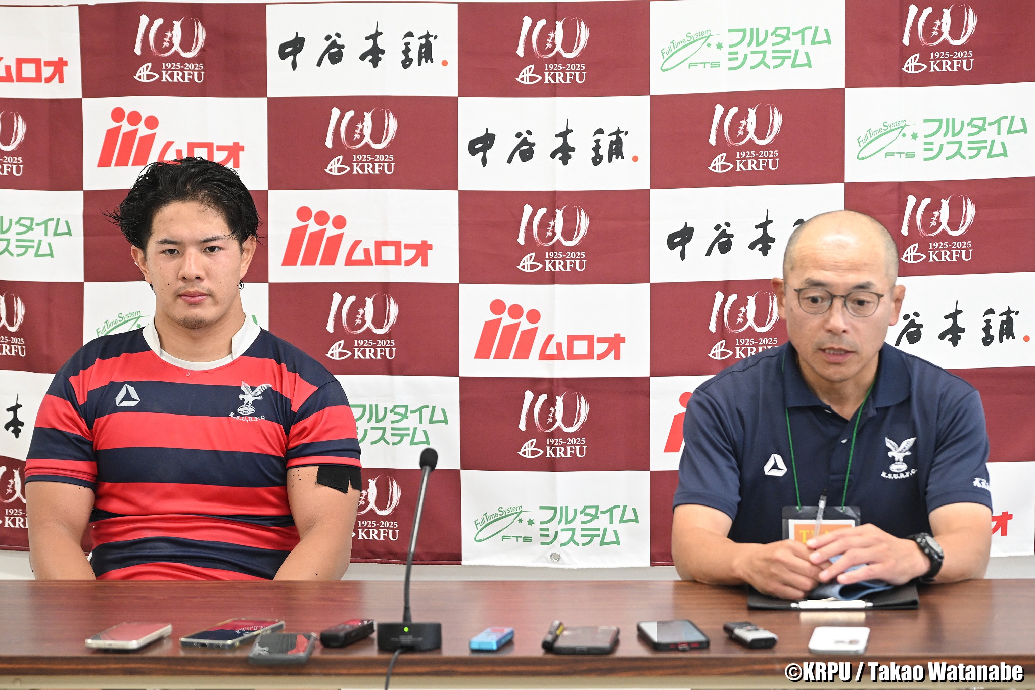 本日はありがとうございます。廣瀬監督からもあったように、自分たちのミスで自分たちの時間を失って、相手にボールを渡してしまうというプレーが多かったんですけど、そういう苦しい状況の中で自分たちの形を戻すことができなかったところが、今日の反省点かなと思います。この後も関西リーグが続いていくので、こういった課題を修正しながらひたむきに自分たちのラグビーをしていこうと思います。