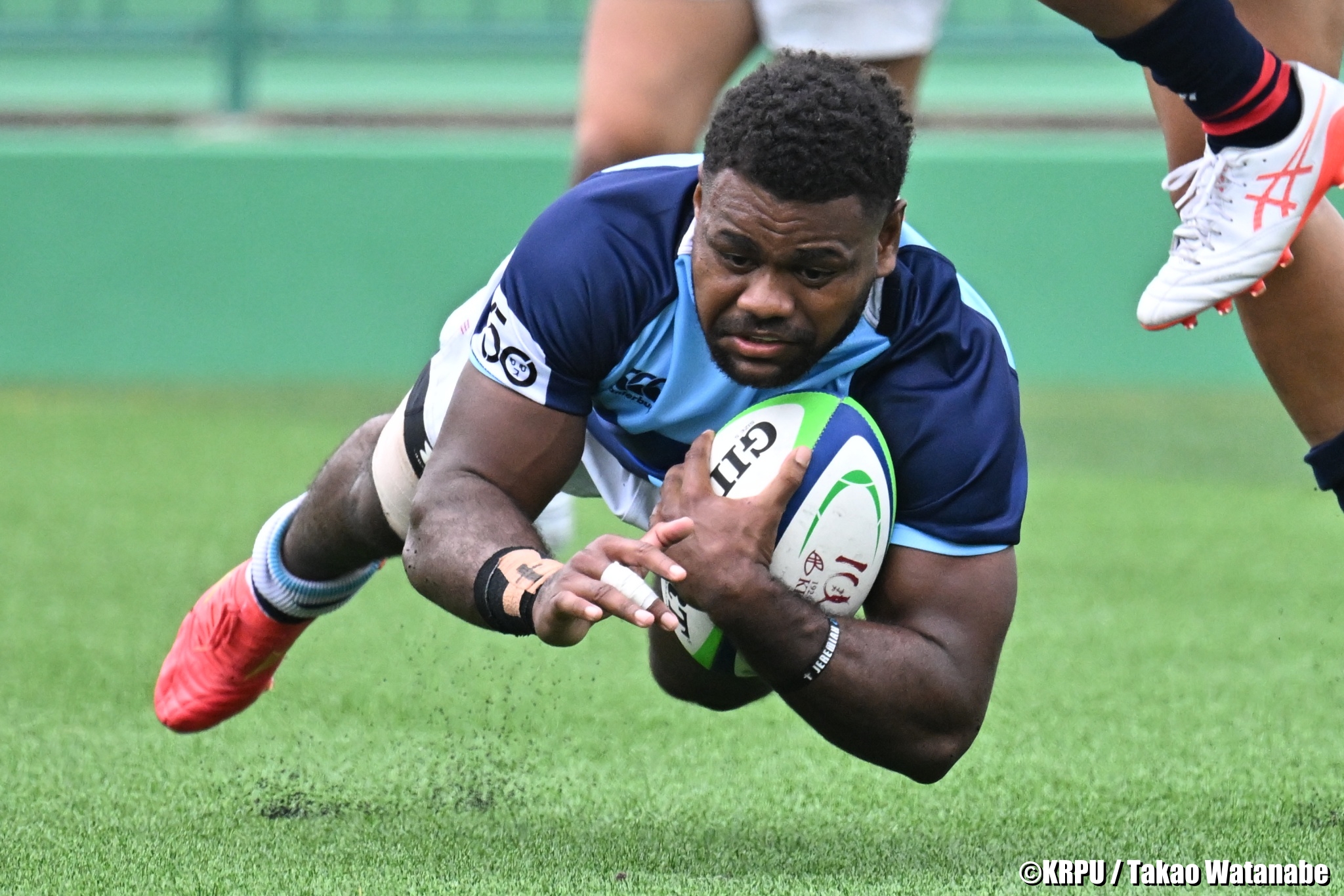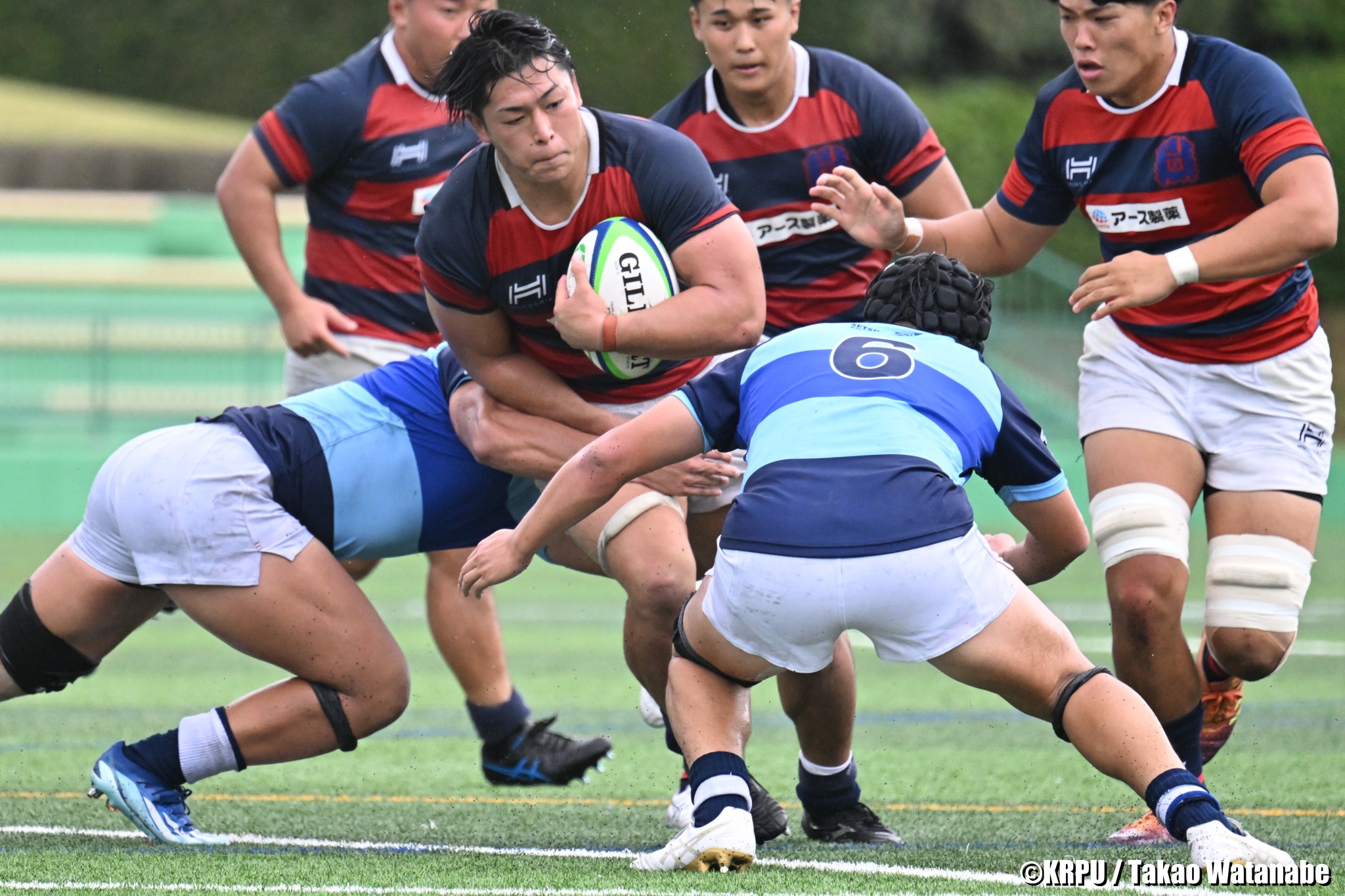 逆転を許した関学大は25分、ゴール前10m右中間のペナルティからタップキックで仕掛けたNo.8⑧小林が前進しサイドを攻め続け、最後はPR③大塚壮二郎が左中間にトライ。GKもSO⑩新井が成功し再逆転。20-21。