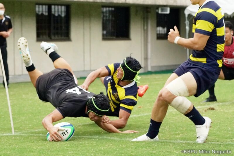 だが、立命大も空かさず返す。BKラインで大きくボールを動かし、最後はWTB⑭三浦遼太郎から内返しでもらったFB⑮久保田がトライで再逆転。立命大BKが力のあるところを見せる(19-22)。