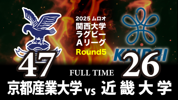 近畿大が自陣22ml付近の右ラインアウトから攻めるが、京産大はSO⑩吉本の好タックルでチャンスを掴み、FL⑦伊藤のキックがトライゾーンで止まりCTB㉒吉岡佑真が押さえてトライ。GKもSH⑨髙木が成功しノーサイド、47-26。