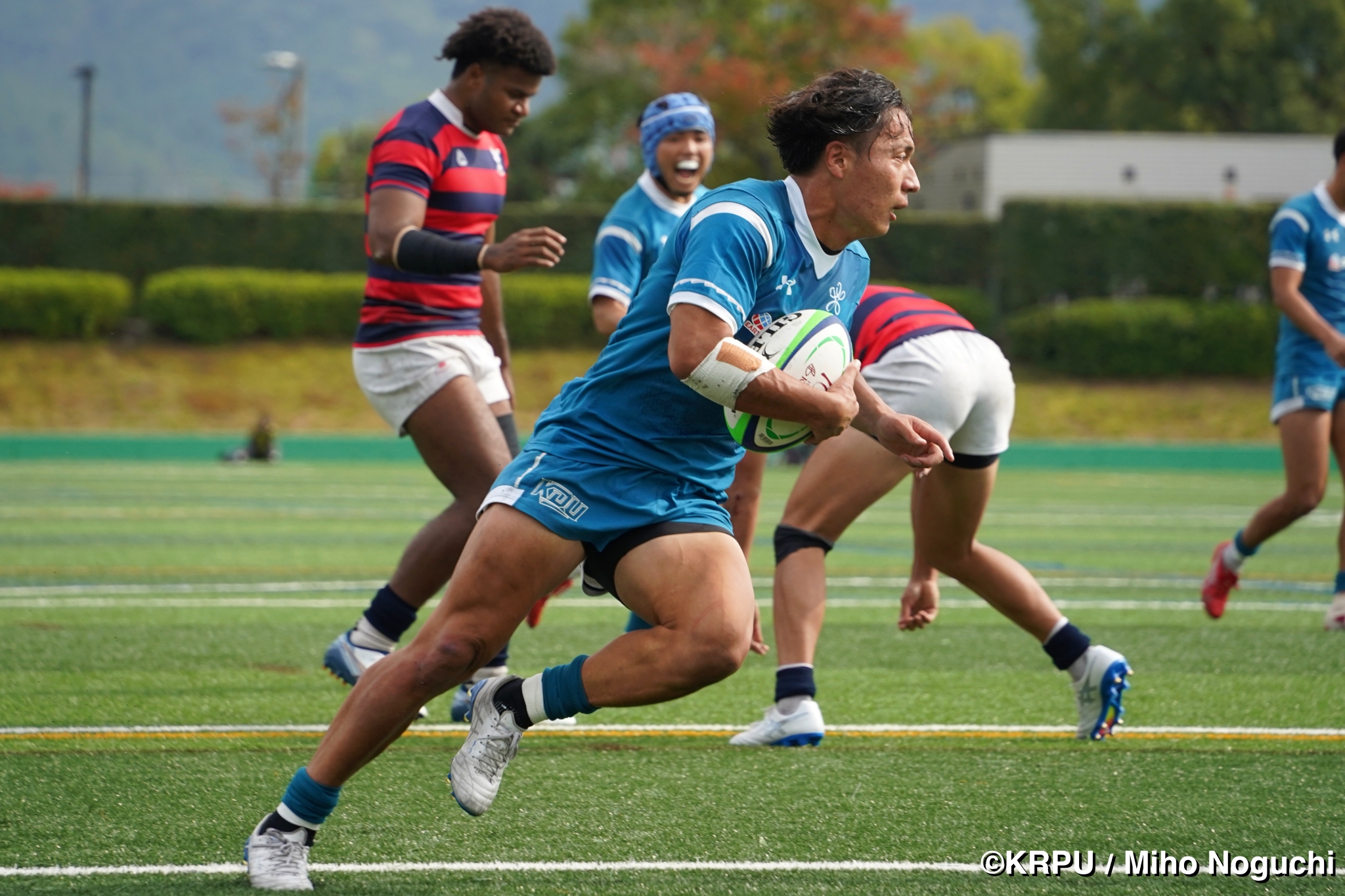 36分、近畿大の攻めをFB⑮宮里快一がスチールを決めチームの危機を救い、SO⑩吉本がタッチに蹴り出す。その後、中央右ラインアウトからモールで攻め、フェーズを重ね最後は途中出場のWTB㉓太田陸斗がゴールポスト左にトライ。GKもSH⑨髙木が成功し、40-26。