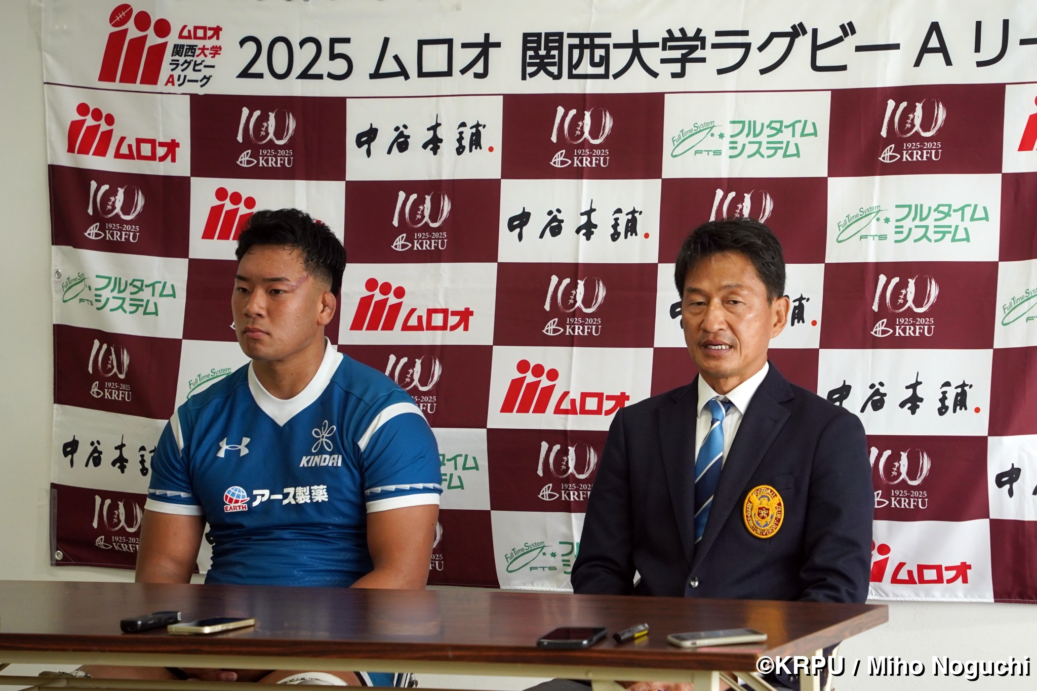 前節の同志社戦の(前半10分で2トライされた)反省から、(中1週間という難しいコンディションではあったが)前半絶対に集中して自分たちのフィジカルバトルに拘ろうと話をしていて、前半はすごく良い入りができた。ただ、後半開始20分のところで近畿大学さんの(意地というか僕たちの試合にかけてくる)プレッシャーを受けて一時同点になったが、そこで落ちることなく(僕であったり吉本であったりとそういう)プレイヤーがしっかりしゃべってくれて、(一つにもう一度まとまって)近畿大学さんを圧倒しにいこうという姿勢を最後の後半20分に見せられた。それがスコアに反映されて勝ち切れたことは良かったと思います。ただ、その部分(後半最初の20分)を修正していかないと、関学、天理は凄いタフな相手だと思うので、関西優勝のためにもう一度レベルアップしていきたいです。