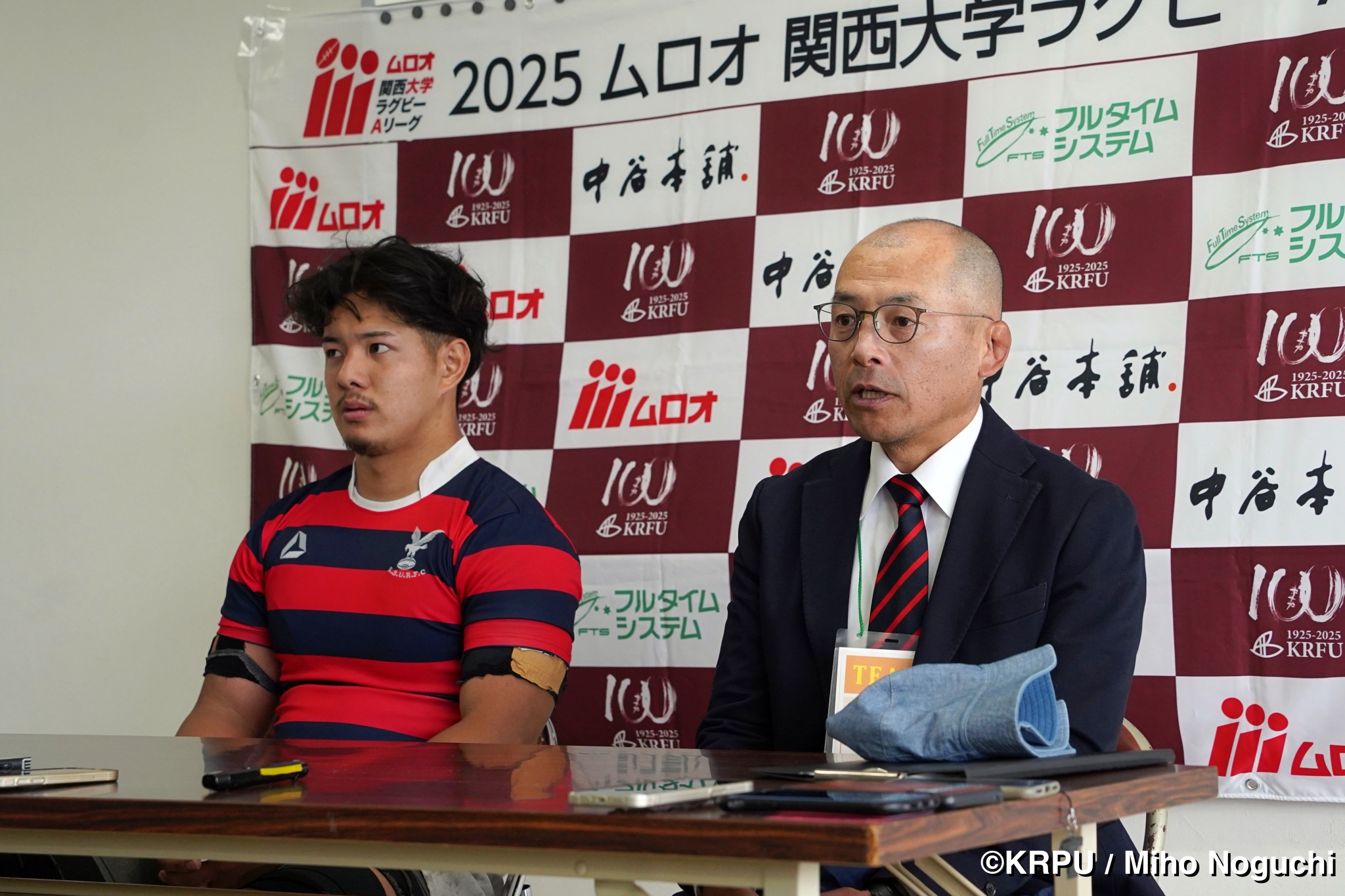 上位チームと当たるということでよりタフな試合になることは分かっていたので、前半入りの部分は素直に評価したらいいと思っています。ただ、関学、天理との試合をものにするためには、後半入りの20分、自分たちの時間を多くとるというのが80分の中でテーマだと思うのでそこをもう一度修正して臨みたいと思います。 前半はアタックでもデフェンスでも相手より低く早く走るということが徹底できていたと思うのですが、後半の入りは、(中1週間で疲れなのか?気の緩みなのか?まだ整理できていないが)少し足が止まってしまったのかなというのが印象にあります。ここ(後半最初20分間)を拘って自分たちのもの(時間)にできれば、もっと試合展開は楽にできる。先にハードワークして相手を疲れさせるというのが京産大のテーマでもあると思うので、走るということ、そこは意識したいです。