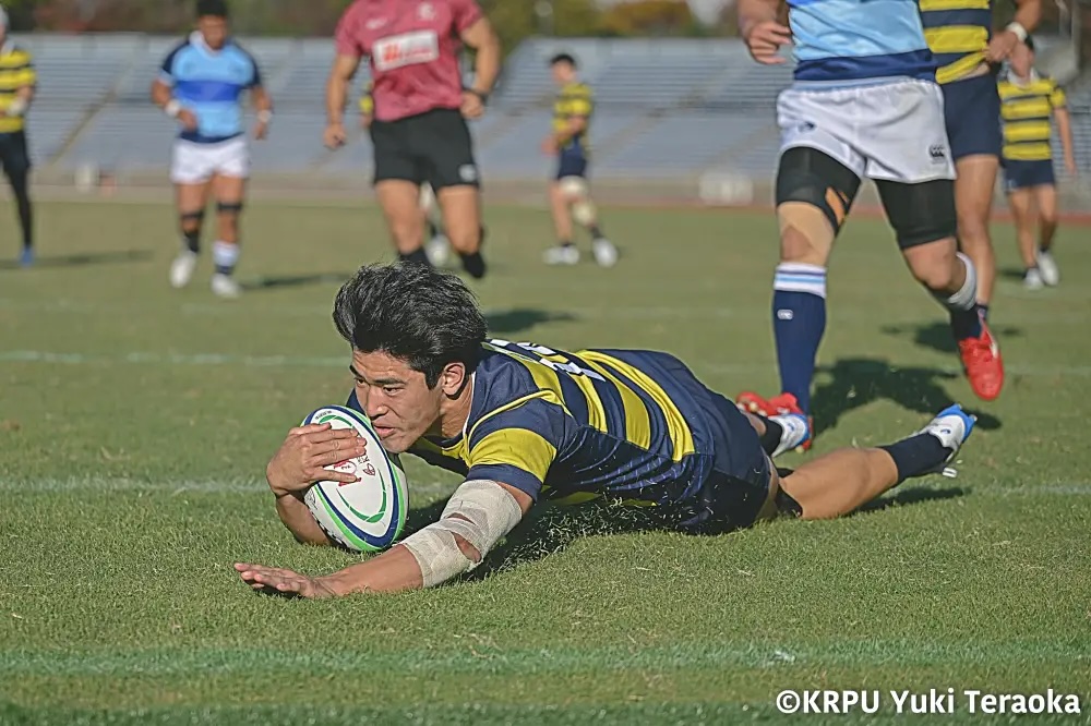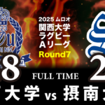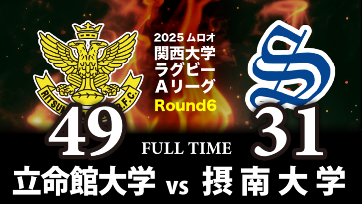 立命大は後半29分、立命大陣に長く攻め続けた摂南大を懸命のディフェンスでしのいだ立命大はノックオンで得た自陣左サイド22m付近のスクラムから右へ展開しキックを絡めながら前進。摂南大がキックで返すと立命大はキャッチからFW・BK一体となって素早いアタックを継続。最後は相手陣右中間35m付近でパスをもらったFB⑮久保田がゴール右サイドへグラバーキックしてそのままトライ、CTB⑫中村のコンバージョンキックも決まり、立命大が42-24。