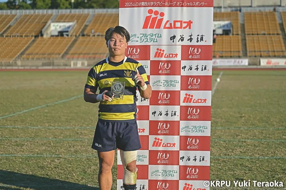 この試合のプレイヤーズオブザマッチは、1トライと7本のコンバージョンキックすべて成功し大きく勝利に貢献した、立命大CTB⑫中村颯汰選手が選ばれました。