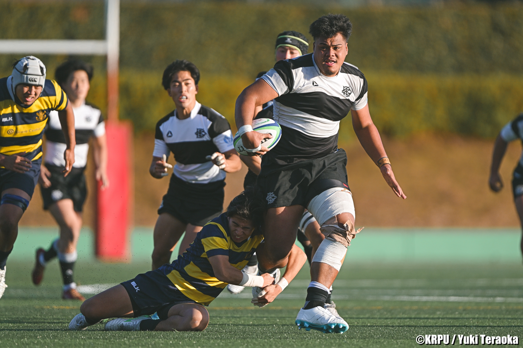 大体大も26分に1年生WTB⑪山内デイビスがスピードを魅せてのトライ(GK成功)、35分には130キロとビッグサイズのLO⑤コロ・ソナタネが豪快にトライを決めるも…。