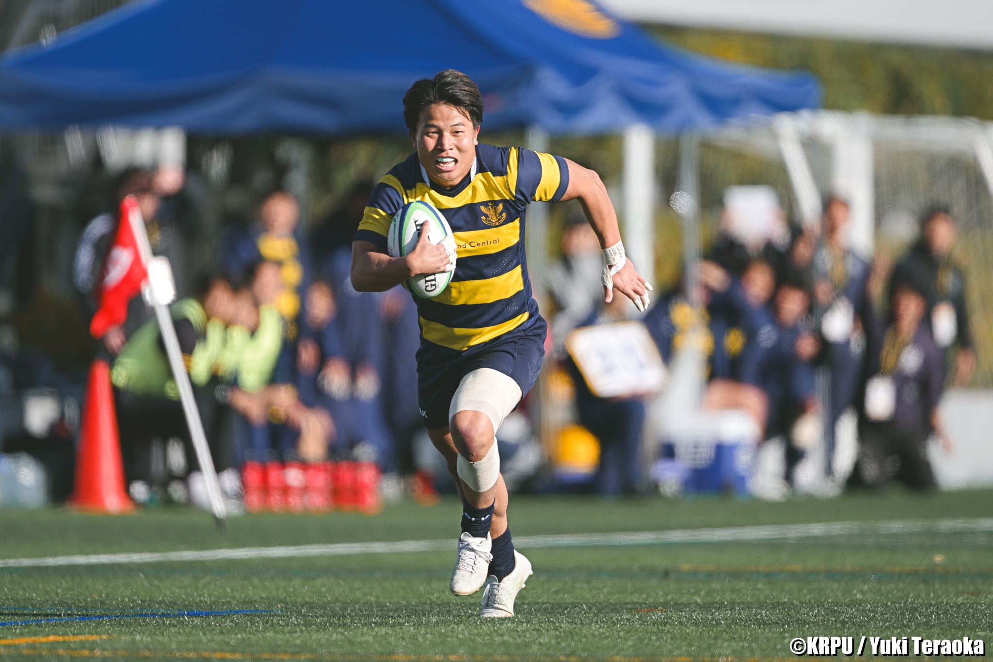 だが、27分には大体大がスコアした。自陣22M付近でNO.8⑧三田村大喜がインターセプトからブレイク。足に引っ掛けたボールを追いかけSO⑩小野田武琉が走り勝ち、右中間に転がるボールを抑え込んでのトライ。GKも自ら決めて追い上げを図る。(19-7)