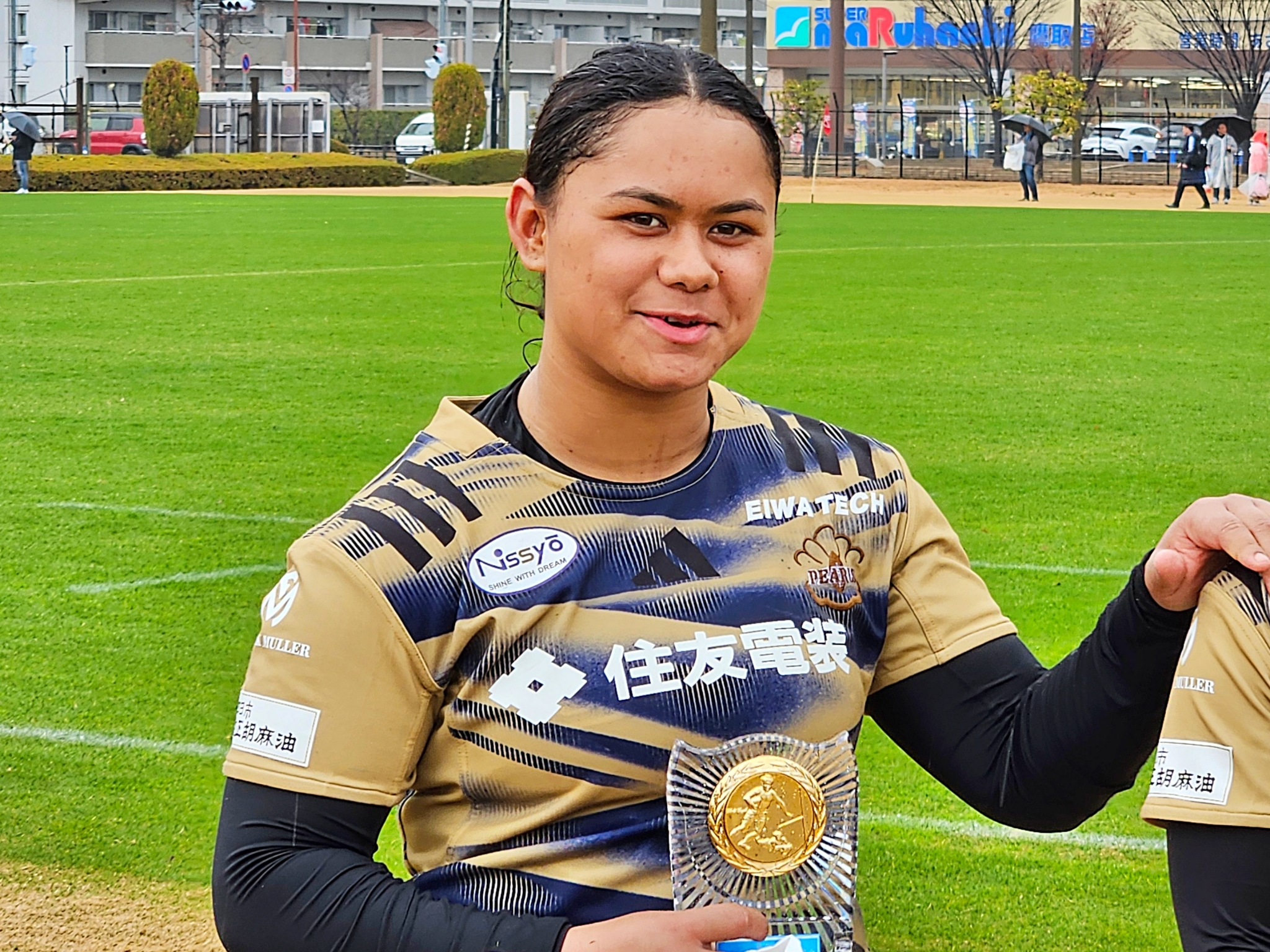 Player of the matchは、先制をはじめ3本のトライを奪ったPEAELSの⑬コカコと、日経大の全得点(2PG)を挙げた⑩椎村が選ばれた。