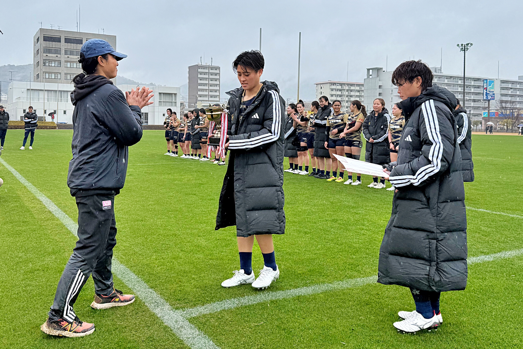 結果は、雨で少しミスが多かったが、フィジカルで少し優位に立ったPEAELSが⑩ロージーを中心に試合をコントロールし、日経大をノートライに押さえて、6-59で勝利、優勝を勝ち取った。