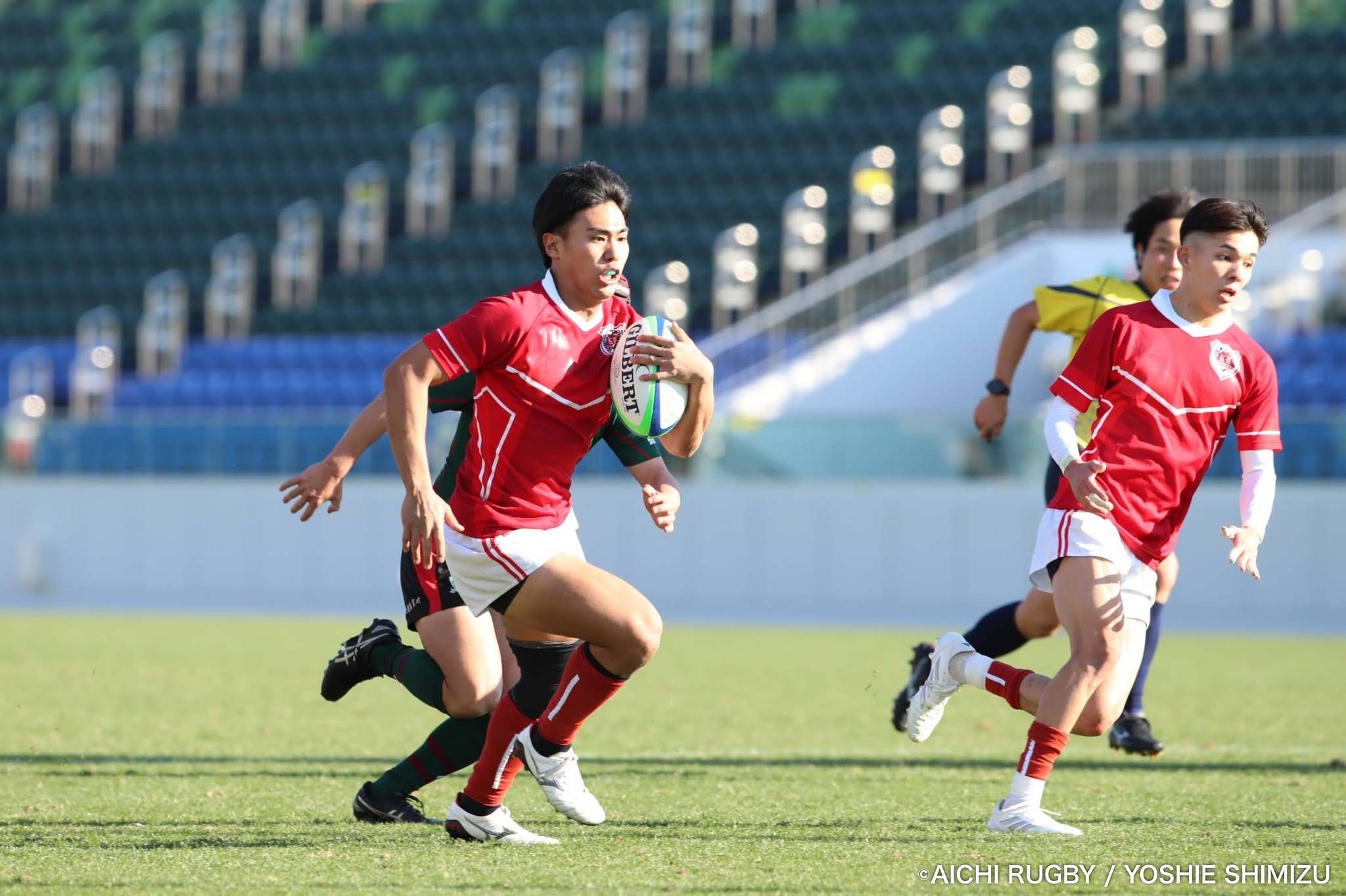 鹿児島大学は後半7分、中盤からモールで前進すると、ディフェンスを見定めサイド攻撃。SH⑨田中堅がライン際を走りトライ。コンバージョンも成功し、26-5と幸先の良いスタートを切る。