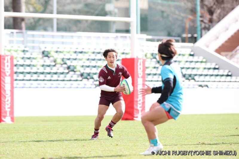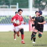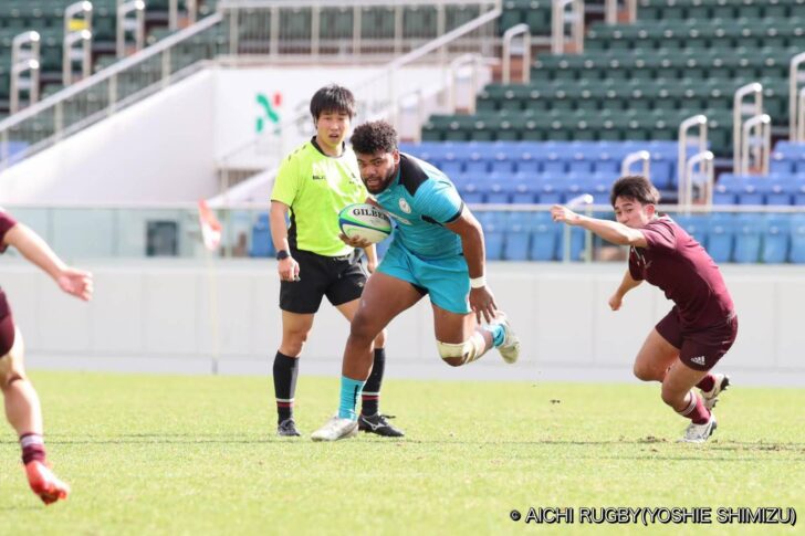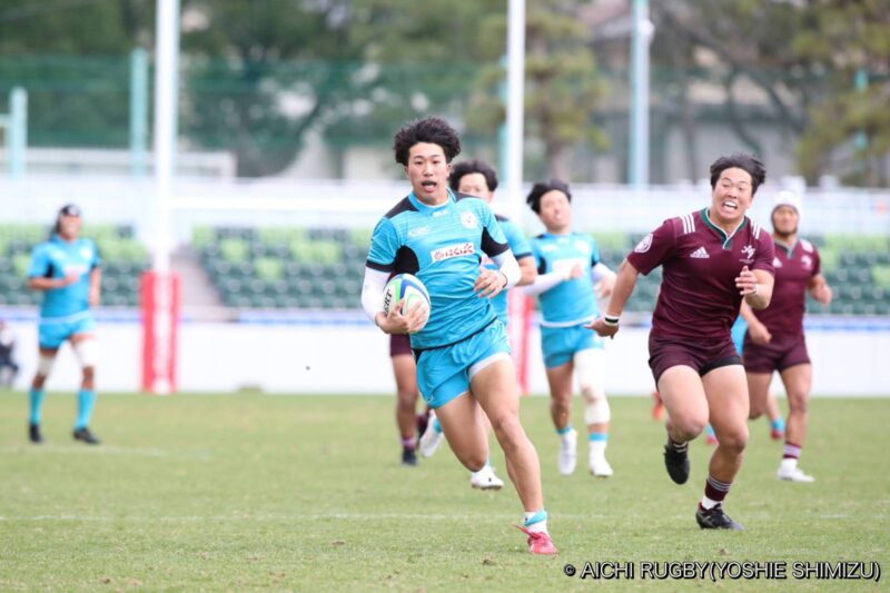 山梨学院大は、前半14分には、相手ハイパントからキャッチし展開を図る中で、パスミスで転がるボールをNo8⑧ネマニが拾い上げ、自陣10m付近にてバックフリップパスでSO⑩篠原悠士へパスが渡ると相手ディフェンスを見極めコース良く走りきり、右サイドへトライ10−0とする。