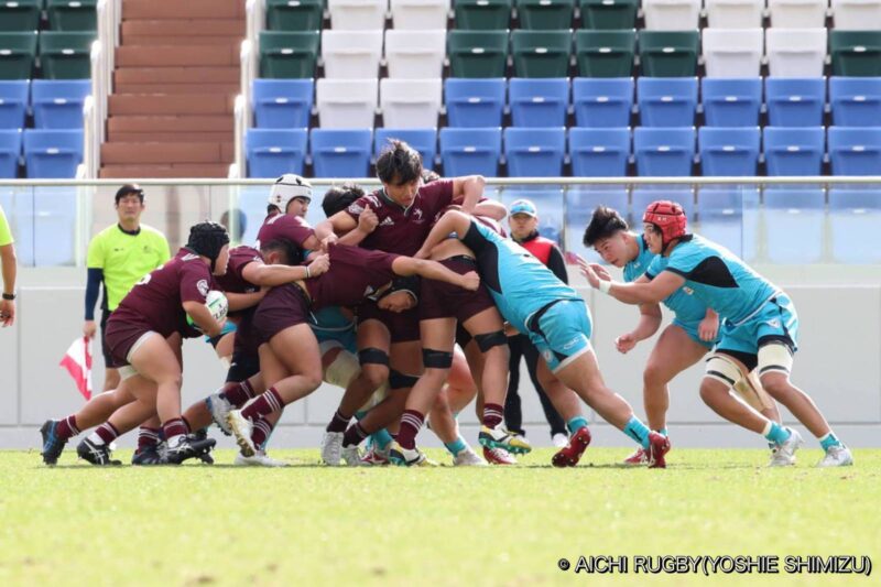 両チーム、ハンドリングエラーで決定機に至らないなか、残り時間が少なくなる中、金沢学院大は自陣22m付近から果敢に攻め、相手ペナルティーからキックで前進、相手陣22m内側左ラインアウトでは、モールを形成、ゴール前へ迫るとHO⑯平安山結丸がトライ、フルタイム。