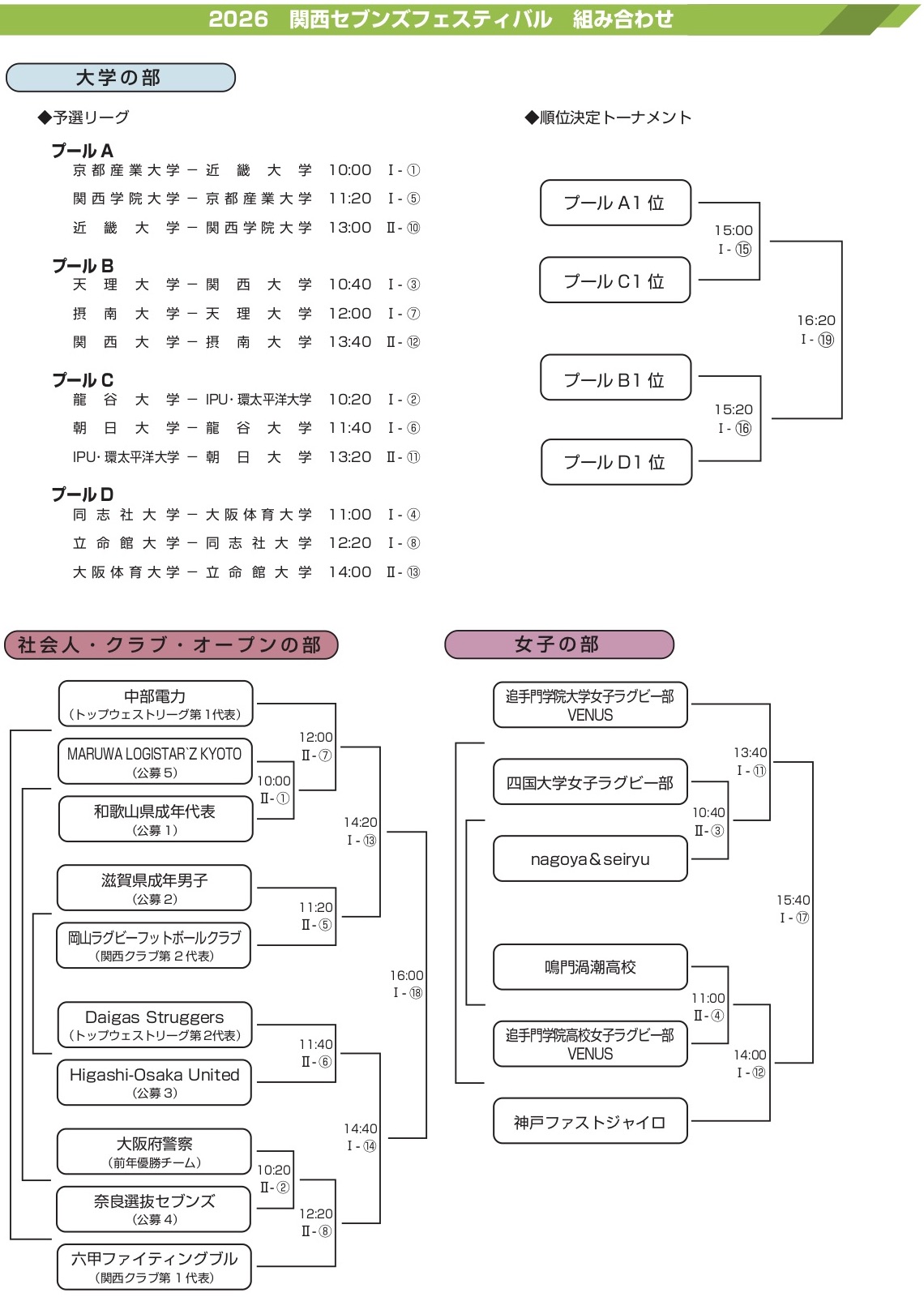 | Ⅰ-16 | 大学 | 準決勝 | 15:20 | 関西大学 プールB1位 | 10-19 | 同志社大学 プールD1位 |