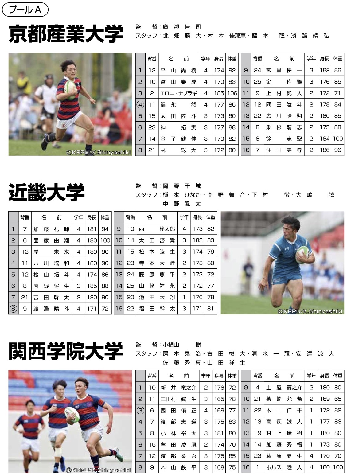 | Ⅰ-5 | 大学 | プールA | 11:20 | 関西学院大学 | 40-21 | 京都産業大学 |