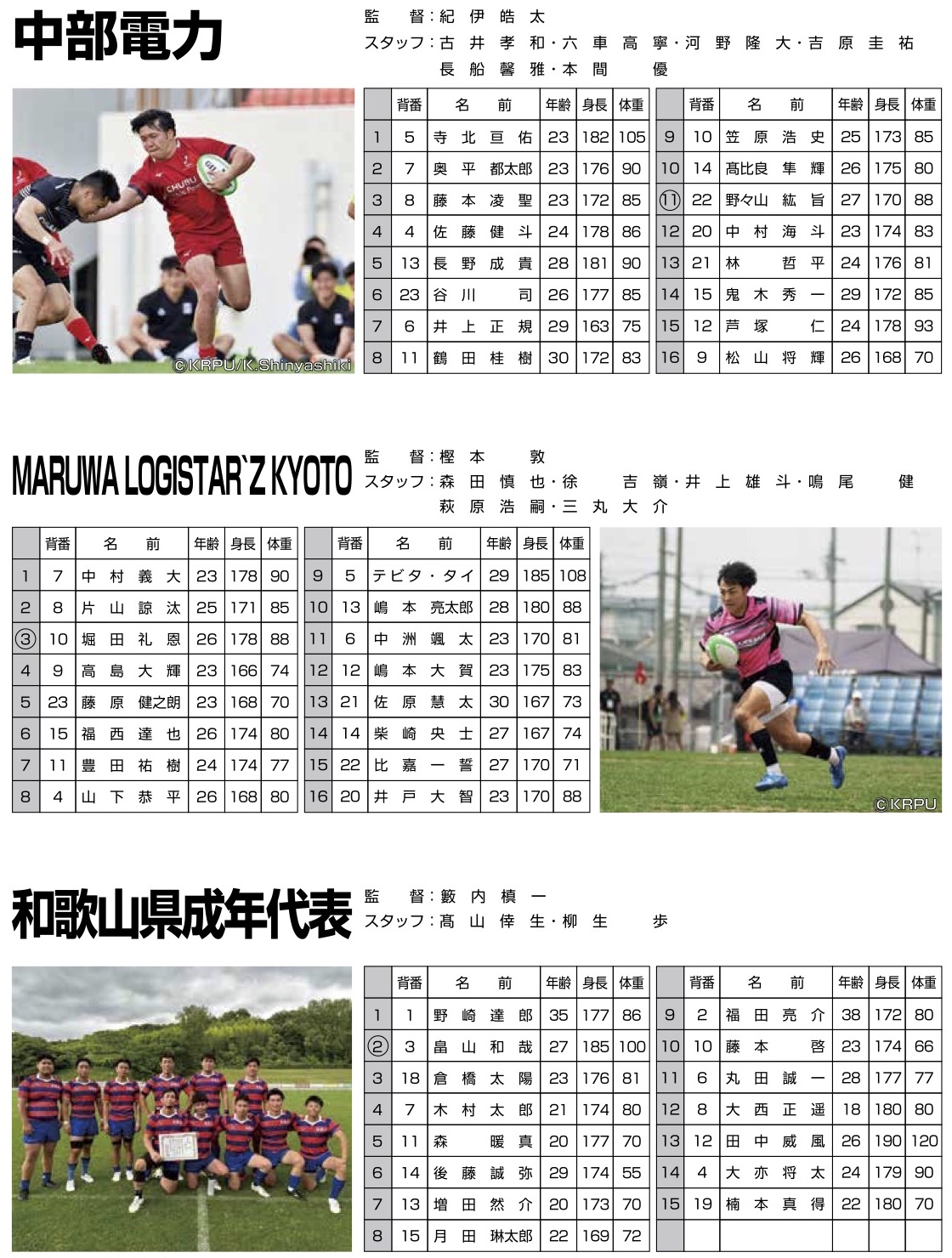 | Ⅱ-1 | 社・ク・オ | 1回戦 | 10:00 | MARUWA LOGISTAR’Z KYOTO | 31-19 | 和歌山県成年代表 |