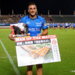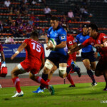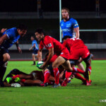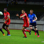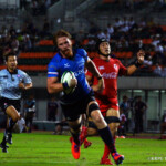 対するコーラは、24分、敵陣22m右スクラムより⑧ソロモン・キングのサイド攻撃から⑭築城へ。力強いランニングでゲインし、⑤サム・ワイクスへオフロードパスが渡り右隅へトライし、5-12と反撃開始。⑫ティモシーのゴールは不成功で5-12。