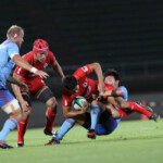 34分、自陣22mからの連続攻撃で11番山下(楽)がキックしたボールを相手が処理にもたつく。山下自らボールを拾って中央にトライ(7-39)。15番レイのG成功(7-41)。