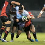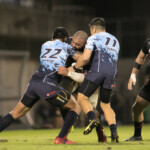 東芝リチャード・カフィにタックルするヤマハCTBヴィリアミ・タヒトゥア