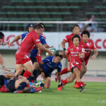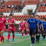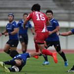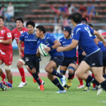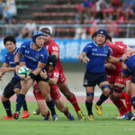 8分ドコモ、右FLハインリッヒ・ブルソーが、16分No8朴淳彩がトライを奪った。攻撃の手を緩めないドコモは、更に相手ノックオンからのターンオーバー、キックオフからのノーホイッスルトライなど20~43分の間に9トライを重ねた。結局、終わってみれば122-3と予想外の大差となってしまった。