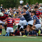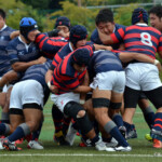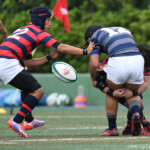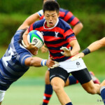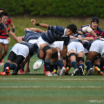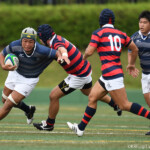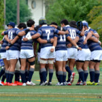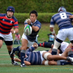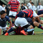 京都産業大学のディフェンスは厳しく、同志社大学はハンドリングミスが出て、なかなか取り切れない。京都産業大学は前半26分、同志社大学陣10m付近のラインアウトからモールを組み、こだわりを見せて、最後は④が同志社大学ゴールに飛び込んだ。⑩のゴールも成功し、21対7とリードを広げた。このまま前半は終了。