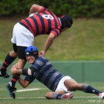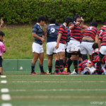同志社大学は⑨からのハイパントを織り交ぜ、前進を図る。京都産業大学は、FW戦にこだわり、スクラムでも再三プレッシャーをかけ、反則を誘う。前半20分、ディフェンスラインが良く前に出ている京都産業大学は同志社大学のキックを⑫がチャージ、すぐさま⑩拾ってトライ。⑩がゴールを決め、14対7とリードする。
