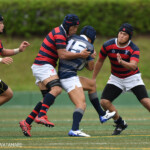 京都産業大学のキックオフで試合開始。同志社大学はFWの早い集散で前進を図り、京都産業大学は好ディフェンスからターンオーバーで応酬する。お互い一歩も引かいないという姿勢が見て取れた。
