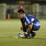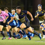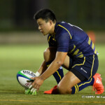ところが20分のウォーターブレイクから立命館のDFがほころび始める。何とか踏みとどまっていたが30分、HL中央のラックから近大が右に展開、大きくゲインしたFB山田聖也を最後はフォローした右WTBキャプテン・山崎圭介が右隅に抑え12-12としSO喜連のゴールも決まり14-12と近大が再逆転に成功した。さらにロスタイムにもトライを重ねた近大が21-12とリードして前半を折り返した。