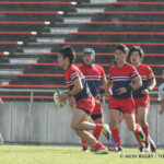 一方、コンテストで勝る東京学芸大学は、フェイズを重ね徐々に徳山大学陣内深くに入り込み、前半24分、相手陣5m中央ラックから⑫高橋が右端へ飛び込みトライ(ゴール成功)。