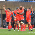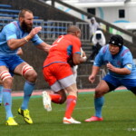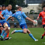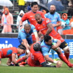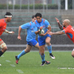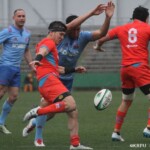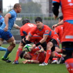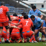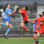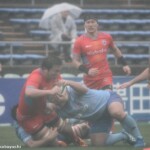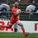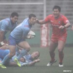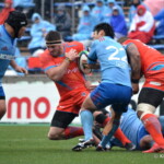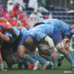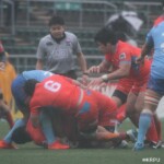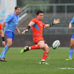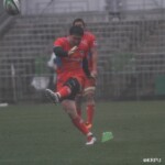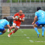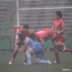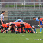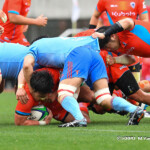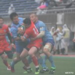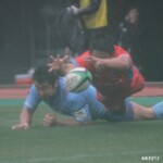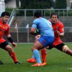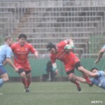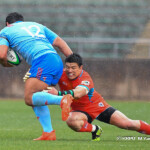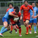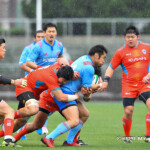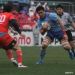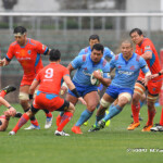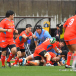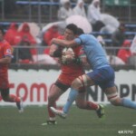 そして11分、クボタが自陣インゴールからのタッチを狙ったキックが味方に当たり、インゴールに跳ね返ったところを、神戸製鋼左PR山崎基生が左中間で抑えトライ、GもSO中山亮平が決め0-7と先制した。この後、神戸製鋼は14分に危険なタックルでレッドカードを受け、14人での試合展開となりスクラムにWTBの中濱寛造が入るなど苦しい試合が続くことになった。一方クボタは25分、自陣10mL中央ラックからSH井上大介がラック外側のオープンサイドに神戸SHが移動したのを見逃さず密集サイド左を抜け、左FL田村玲一から左CTBライオネル・マプーに繋ぎ左中間にトライ。CTB立川理道のGはポールに嫌われ不成功、7-5とする。