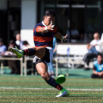 ロスタイムになっても攻め続ける同志社大は、ゴール前のペナルティをキャプテンFL野中のタップキックから攻め込みサイド攻撃を繰り返し、最後はモールからSH人羅が持ち込み左中間にトライ、GKもSO光部が成功し14-0とリードを広げて前半が終了。
