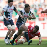 試合は動いたのは22分、ヤマハSOマット・マッガーンのキックを敵陣10m付近で神鋼WTB林真太郎がキャッチし反撃、ラックから右に展開しWTB林がライン際でディフェンスを抜きSHアンドリュー・エリスにタイミングの良いリターンパス。アンドリューは走り込みゴール右中間に先制のトライ。SOイーリニコラスのゴールも成功し、0-7と神鋼がリードする。