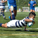 ところが直後の20分、関大はラックからのSHからのパスを受けた1番藤井選手がうまいボール回しで左へ展開。最後はWTB14番吉田陸央選手が左隅に抑えて迎えて反撃を開始した。