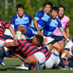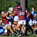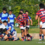 後半の立ち上がりから両チームとも激しい攻防を繰り広げ、どちらが先にスコアするのか注目する中、摂南大のノットロールアウェイの反則でPKを得た京産大がまたもスクラムを選択。