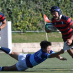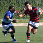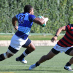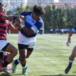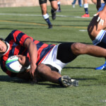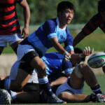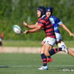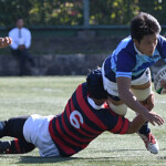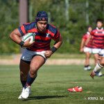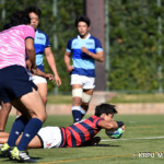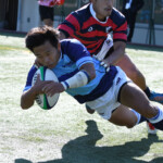 しかし、摂南大は32分、10mラインギリギリに蹴られたキックオフをキャッチ。相手陣10m中央ラックから出たボールをCTB13番トゥア選手が力強く突進し左中間にノーホイッスルトライ。