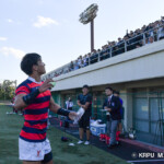京産大のキックオフで後半が開始されたが、ここで京産大に思わぬアクシデント。No88番フィカイ・フェインガ選手が顔面を打撲。そのまま負傷交代となる。京産大にとっては攻撃の核が失われた後半の入りになった。