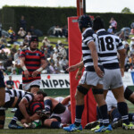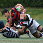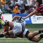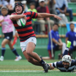 19分、22m左中間のラックからSH野村からパスを受けたLO伊藤が中央を突破し、オフロードパスを受けたFL上田がゴールポスト下に先制トライ、GKもFB河野が成功し7-0。