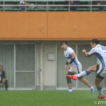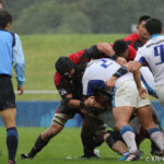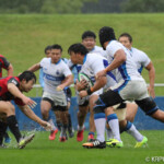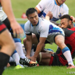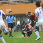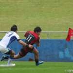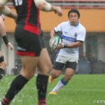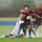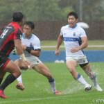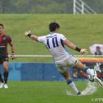 前半、九州電力のキックオフで試合開始。キックオフと同時に雨脚は強まり、キックを多用したゲーム展開となる。Hondaはスクラムを圧倒するも、ハンドリングエラーが多発。一方の九州電力は9分に敵陣22m中央でPGのチャンスを得るも⑨児玉が失敗。その後はHondaがゴール前まで攻めこむもハンドリングエラーが起こりトライには結びつかない。九州電力もHondaのペナルティが続き敵陣で戦い続けるも、なかなかトライに結びつかない。23分には再び九州電力が敵陣22m中央付近でPGを狙うも失敗。どちらもグランドコンディションに苦しみ攻めあぐねる時間帯が続いた。スコアが動いたのは26分。Hondaが敵陣でボールを継続し、⑩デブレチェニが仕掛け、オフロードパスを受け取った⑬森川がトライ。GKを⑫朴が成功させ7-0とする。前半終了間際になると雨脚は更に強まり、両チームともスリップし、なかなかボールが安定しない。そんな中、39分に九州電力が自陣からキックしたボールをHonda⑮トゥアがキャッチし攻め込み、最後は⑤スナイマンが右隅にトライ。GKも成功し、14-0とHondaがリードし前半を終える。