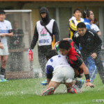 後半に入り、前半同様蹴り合いのゲーム展開となる。Hondaはスクラムを支配し攻めるも、ラインアウトが安定せず決定機を作り切れない。九州電力もDFで粘り続けるもなかなか敵陣で戦うことができない。両チームとも水しぶきを上げながら意地がぶつかり合う激しい攻防が続き、無得点のまま20分が過ぎる。後半24分、Hondaが敵陣ゴール前10mラインアウトモールから左にフォワードがフェイズを重ね、最後はバックスに展開し大外の⑪生方がトライ。GK成功し、21-0とする。その後、Hondaがペナルティを続け九州電力がゴール前まで攻め込み、最後はHonda⑩デブレチェニがオフサイドでシンビンになり33分に九州電力の認定トライ。九州電力が7点を返す。その3分後、今度はHondaが敵陣ゴール前でフェイズを重ね、㉓藤﨑が右大外を走りトライ。GKは失敗し26-7となる。更に40分には敵陣ゴール前10m付近でペナルティを得たHonda⑲ステフマンが素早く攻めトライ。GK失敗し31-7と差を広げる。その後もHondaが攻め続けノーサイドとなり、トップチャレンジ全勝同士の対戦は31-7でHondaに軍配が上がった。